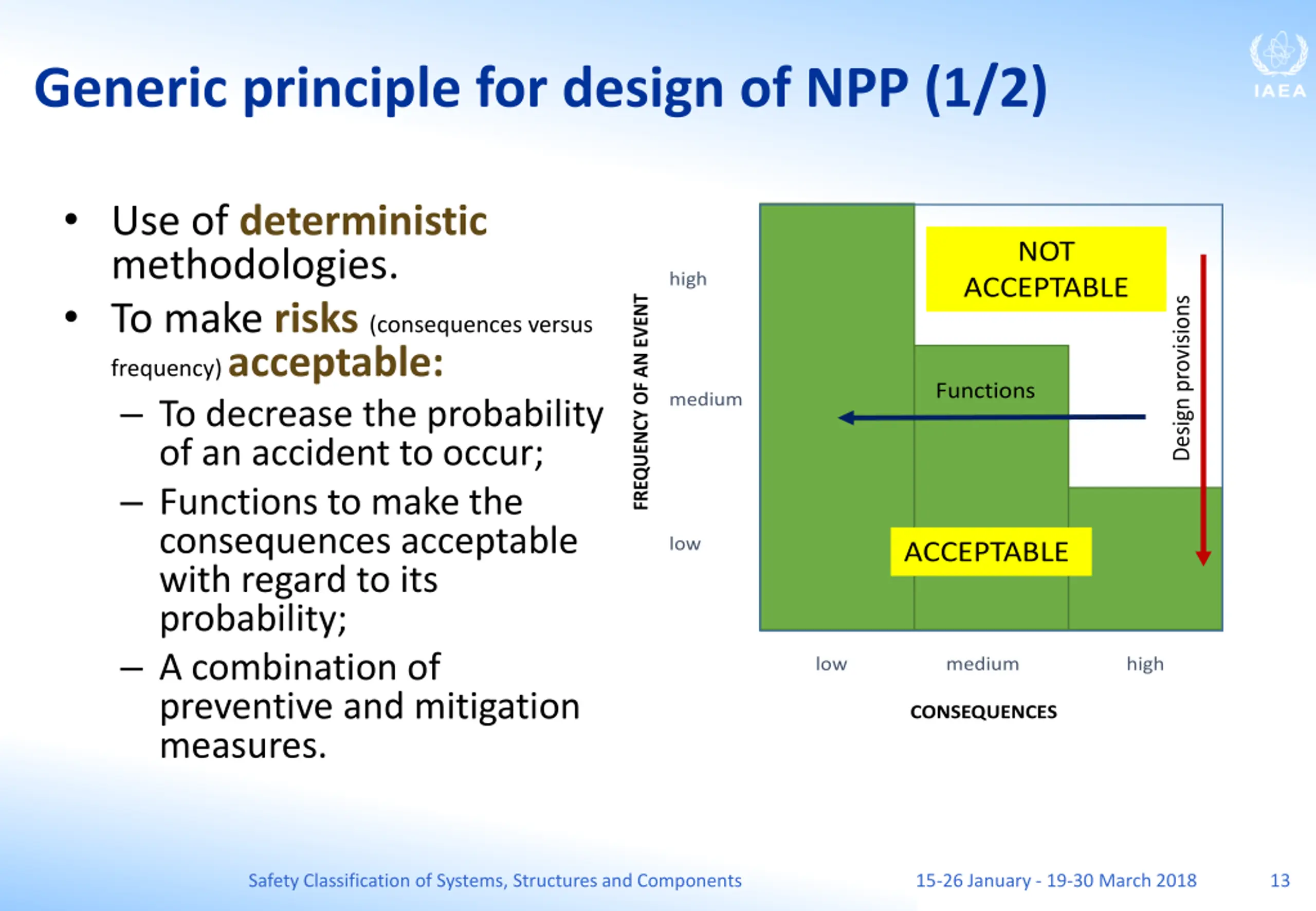 Generic principle for design of NPP (1/2) Use of deterministic methodologies. To make risks (consequences versus frequency) acceptable: To decrease the probability of an accident to occur; Functions to make the consequences acceptable with regard to its probability; A combination of preventive and mitigation measures. NOT high ACCEPTABLE FREQUENCY OF AN EVENT Design provisions Functions medium low ACCEPTABLE low medium high CONSEQUENCES Safety Classification of Systems, Structures and Components 15-26 January - 19-30 March 2018 13
