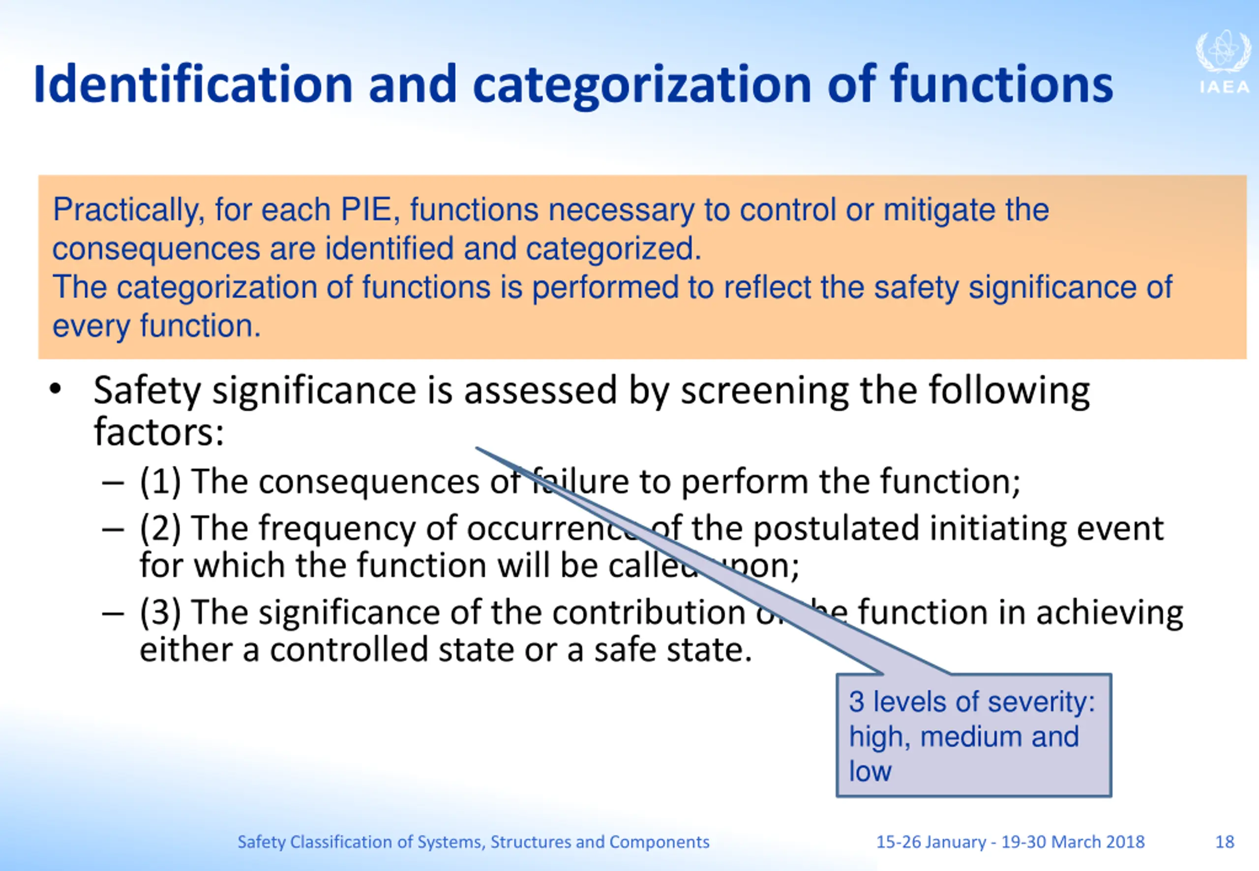 Identification and categorization of functions Practically, for each PIE, functions necessary to control or mitigate the consequences are identified and categorized. The categorization of functions is performed to reflect the safety significance of every function. Safety significance is assessed by screening the following factors: (1) The consequences of failure to perform the function; (2) The frequency of occurrence of the postulated initiating event for which the function will be called upon; (3) The significance of the contribution of the function in achieving either a controlled state or a safe state. 3 levels of severity: high, medium and low Safety Classification of Systems, Structures and Components 15-26 January - 19-30 March 2018 18