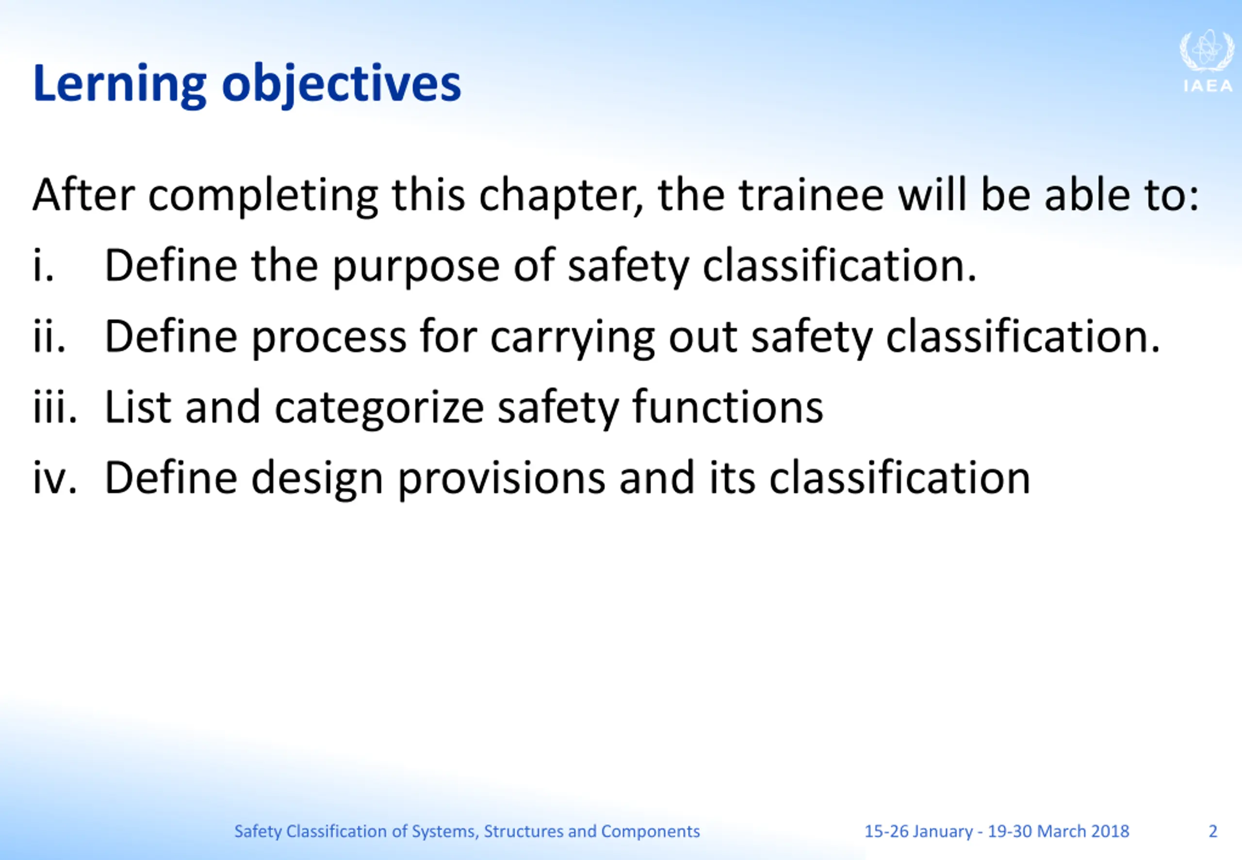 Lerning objectives After completing this chapter, the trainee will be able to: i. Define the purpose of safety classification. ii. Define process for carrying out safety classification. iii. List and categorize safety functions iv. Define design provisions and its classification Safety Classification of Systems, Structures and Components 15-26 January - 19-30 March 2018 2