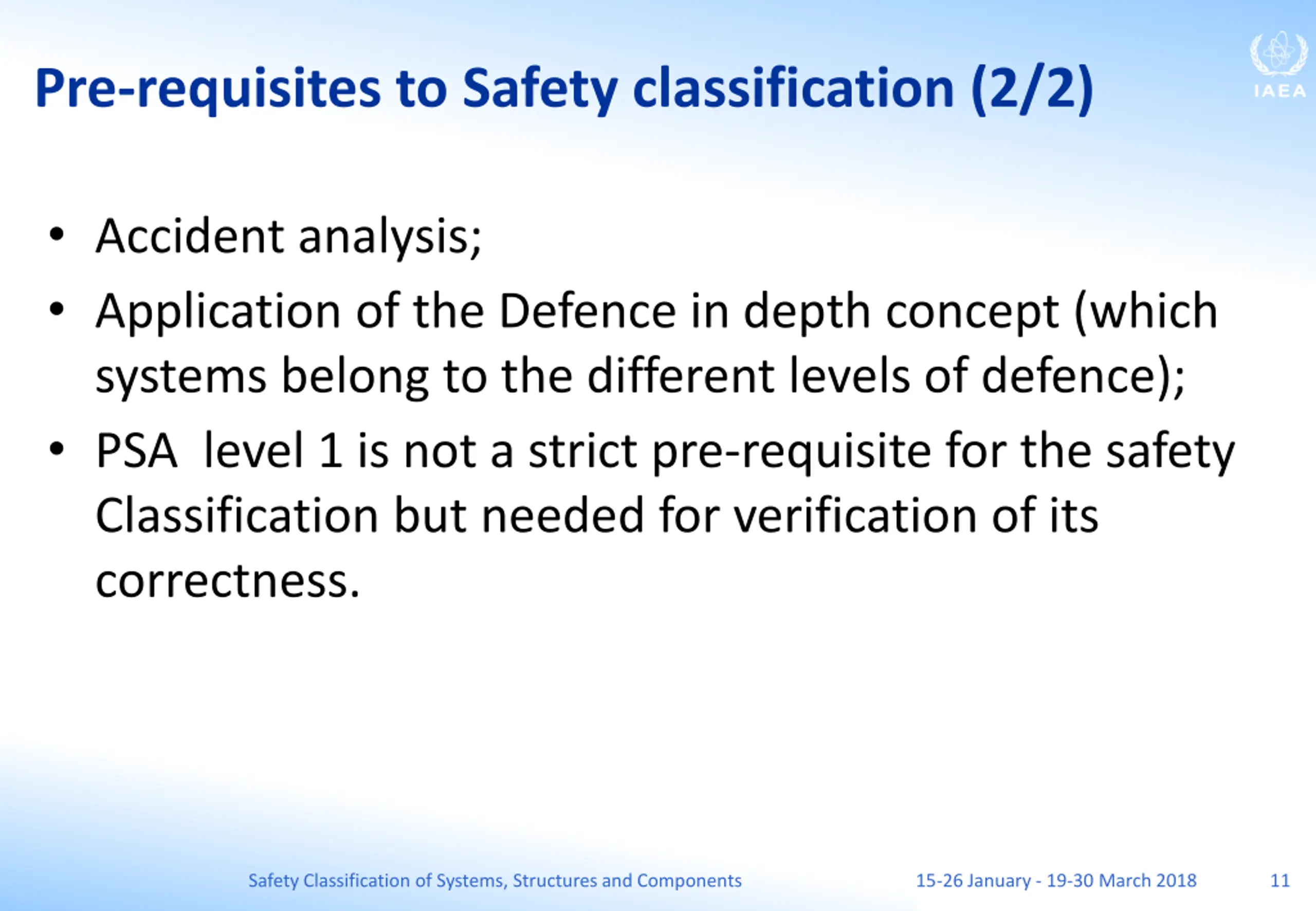 Pre-requisites to Safety classification (1/2) Prior starting the safety classification process, following inputs are necessary: Radiological releases limits established by the Regulatory Body for operational conditions and for the different accident conditions; Plant system description; Plant states definition and categorization; Postulated Initiating Events (PIE) considered in the design with their estimated frequency of occurrence. Safety Classification of Systems, Structures and Components 15-26 January - 19-30 March 2018 10