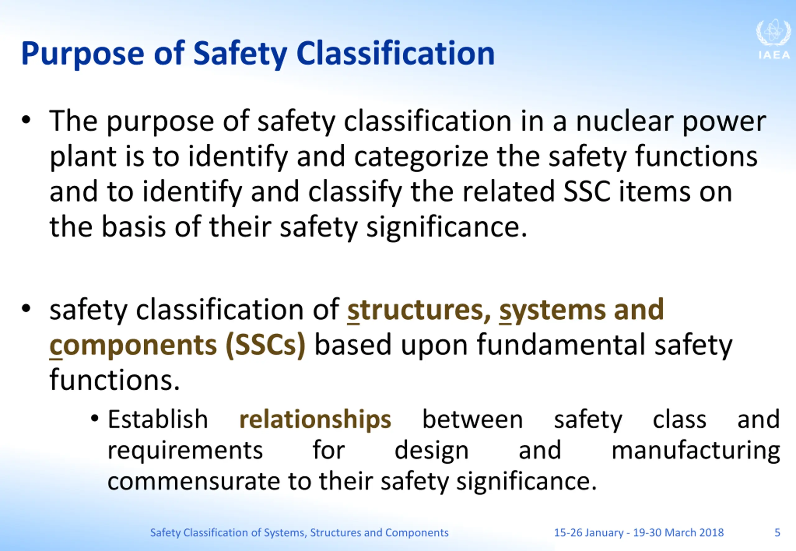 Purpose of Safety Classification The purpose of safety classification in a nuclear power plant is to identify and categorize the safety functions and to identify and classify the related SSC items on the basis of their safety significance. safety classification of structures, systems and components (SSCs) based upon fundamental safety functions. Establish relationships between safety class and requirements for design commensurate to their safety significance. and manufacturing Safety Classification of Systems, Structures and Components 15-26 January - 19-30 March 2018 5