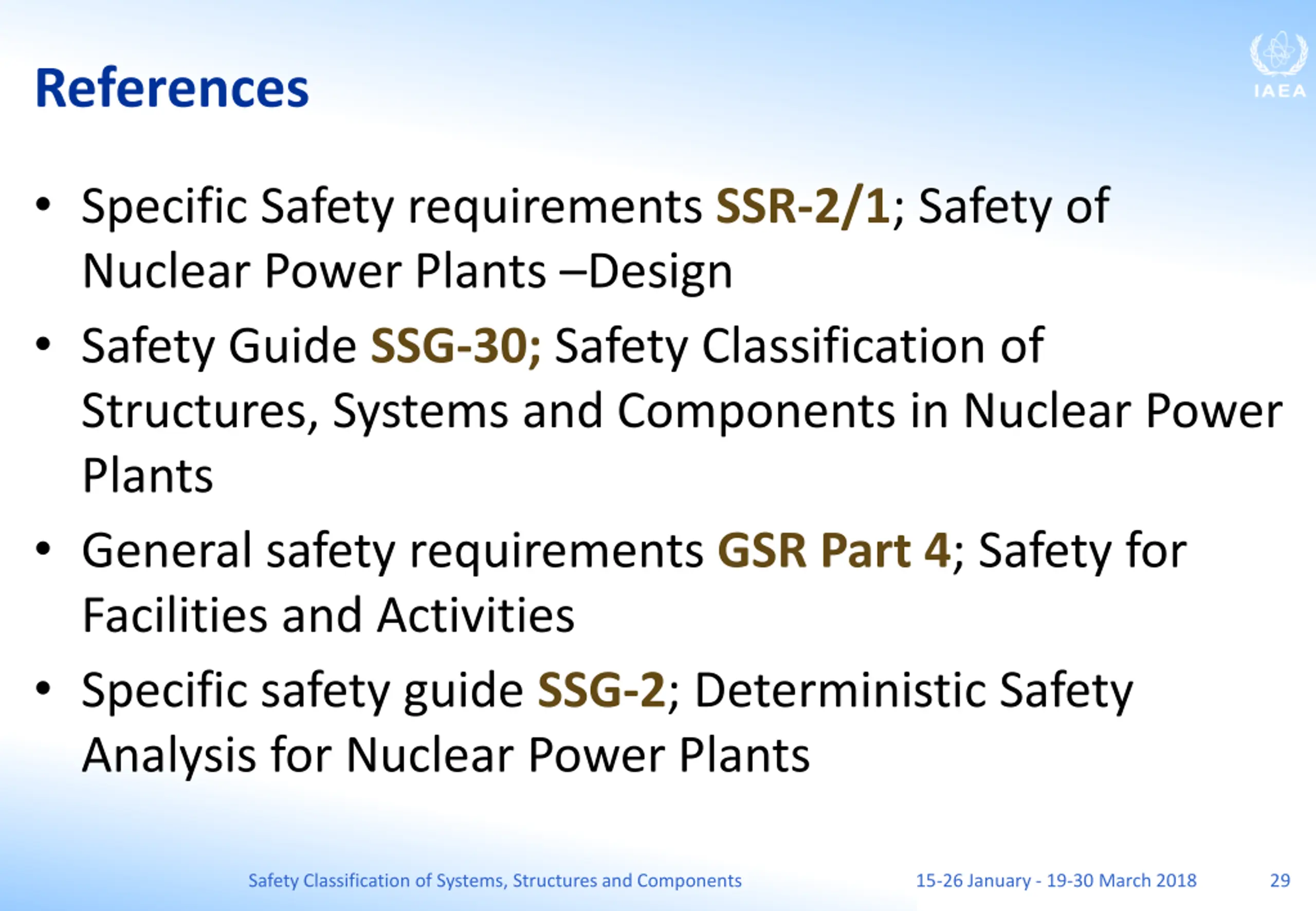 References Specific Safety requirements SSR-2/1; Safety of Nuclear Power Plants Design Safety Guide SSG-30; Safety Classification of Structures, Systems and Components in Nuclear Power Plants General safety requirements GSR Part 4; Safety for Facilities and Activities Specific safety guide SSG-2; Deterministic Safety Analysis for Nuclear Power Plants Safety Classification of Systems, Structures and Components 15-26 January - 19-30 March 2018 29