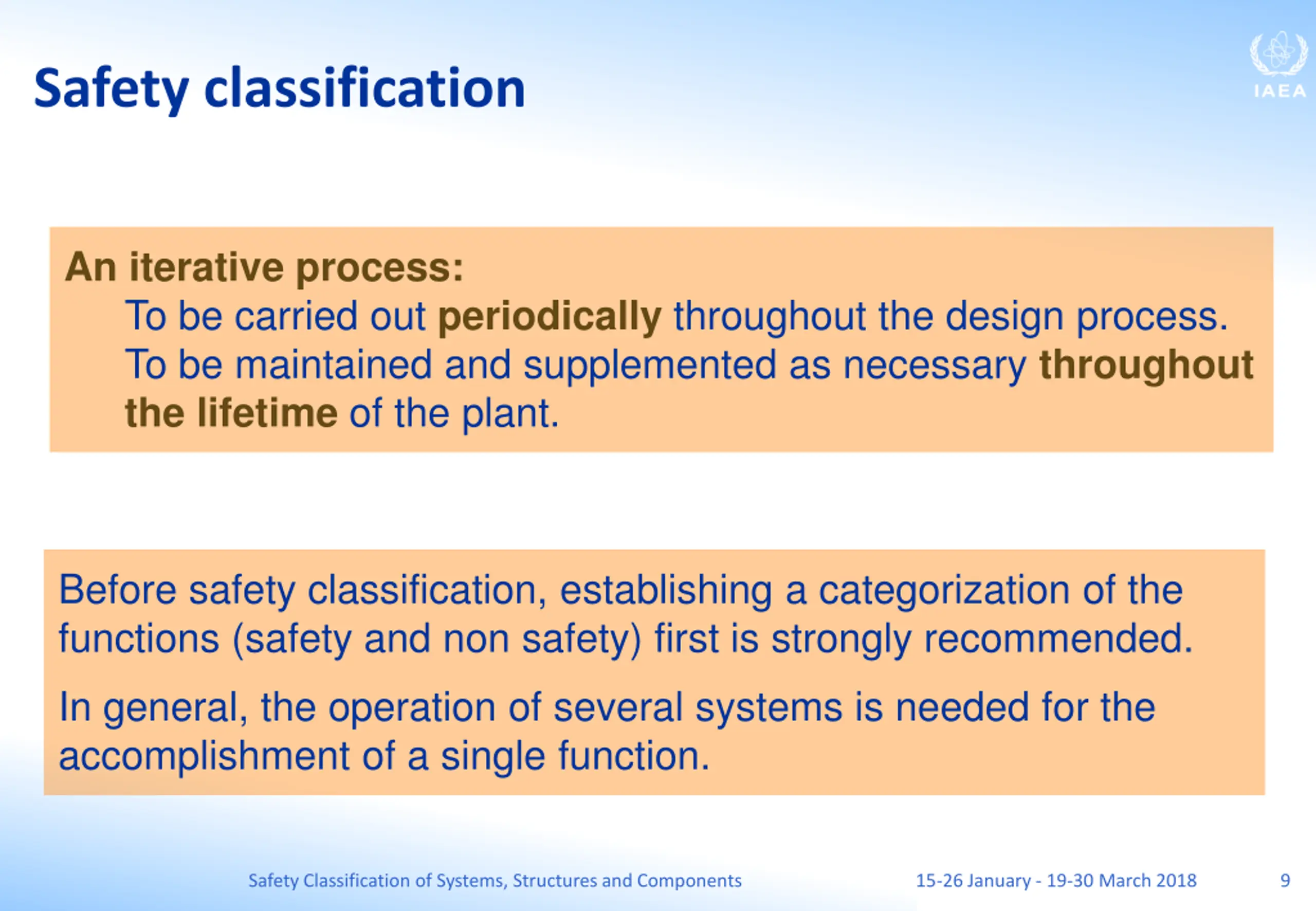 Key points The purpose of safety classification in a nuclear power plant is to identify and categorize the safety functions and to identify and classify the related SSC items on the basis of their safety significance. Safety classification is an iterative process that should be carried out periodically throughout the design process and maintained throughout the lifetime of the plant. Safety Classification of Systems, Structures and Components 15-26 January - 19-30 March 2018 28