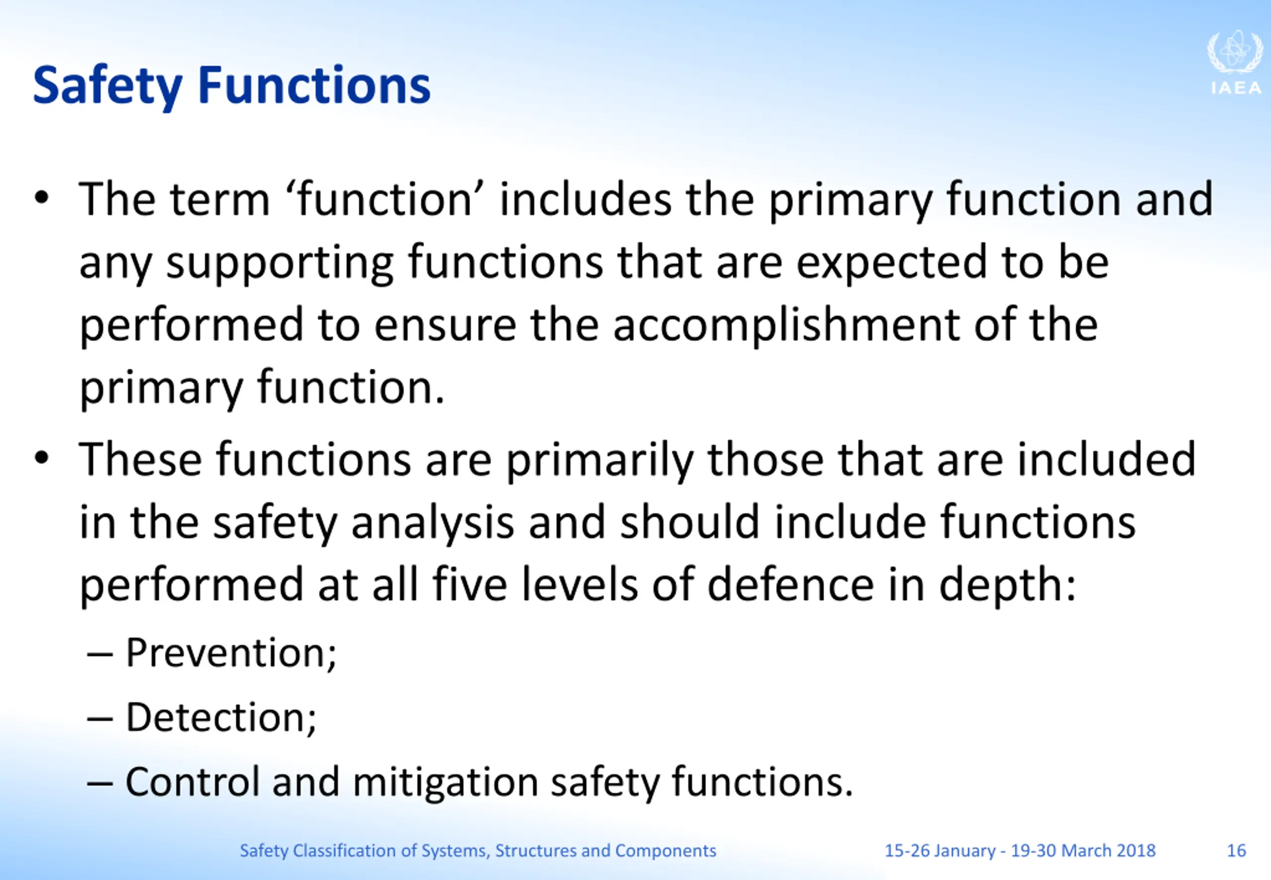 Safety Functions The term function includes the primary function and any supporting functions that are expected to be performed to ensure the accomplishment of the primary function. These functions are primarily those that are included in the safety analysis and should include functions performed at all five levels of defence in depth: Prevention; Detection; Control and mitigation safety functions. Safety Classification of Systems, Structures and Components 15-26 January - 19-30 March 2018 16