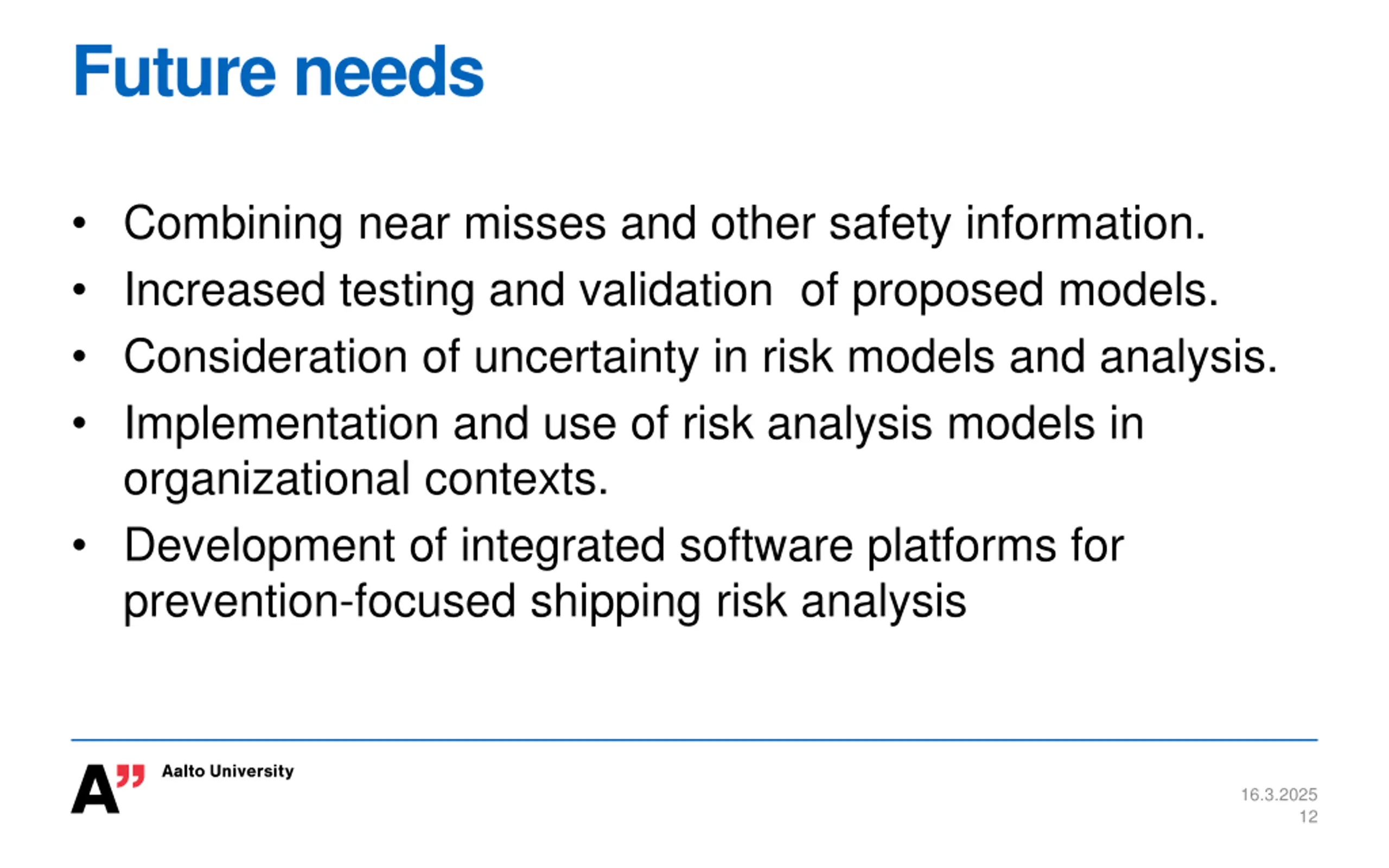 Future needs Combining near misses and other safety information. Increased testing and validation of proposed models. Consideration of uncertainty in risk models and analysis. Implementation and use of risk analysis models in organizational contexts. Development of integrated software platforms for prevention-focused shipping risk analysis 16.3.2025 12