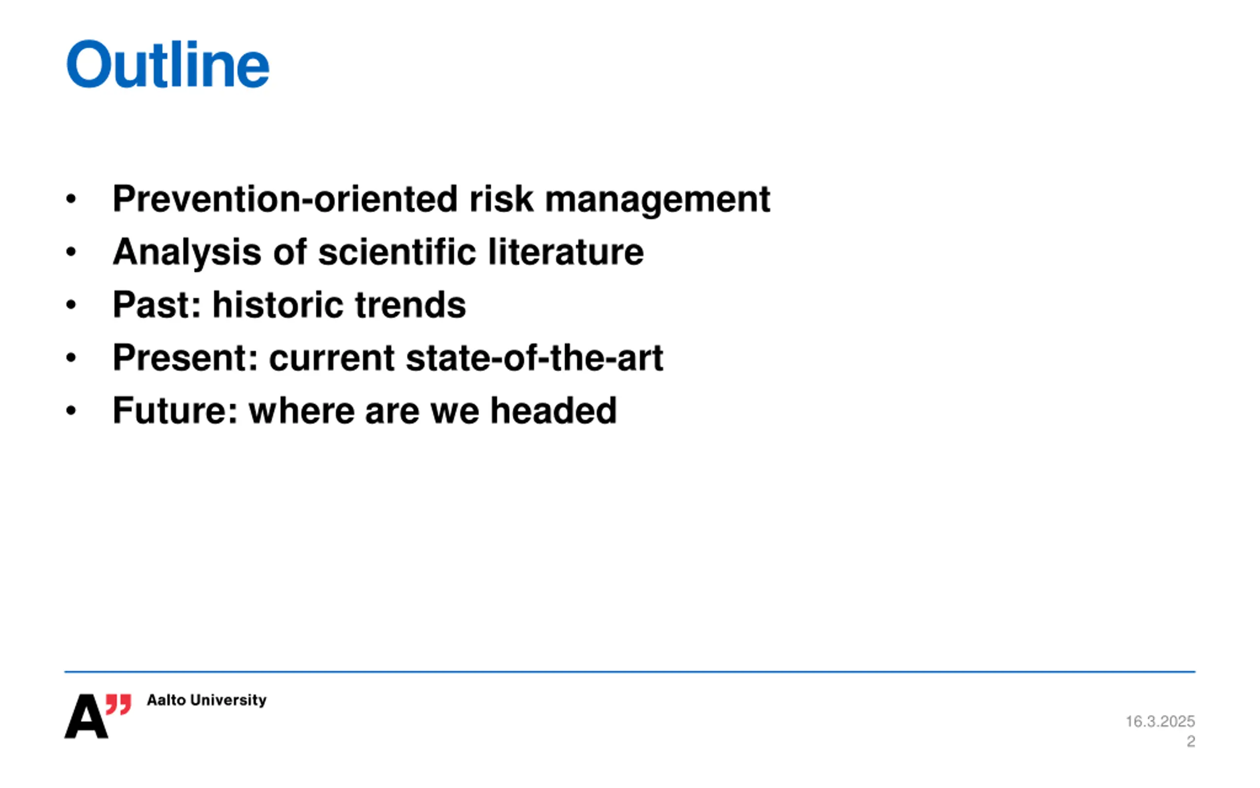 Outline Prevention-oriented risk management Analysis of scientific literature Past: historic trends Present: current state-of-the-art Future: where are we headed 16.3.2025 2