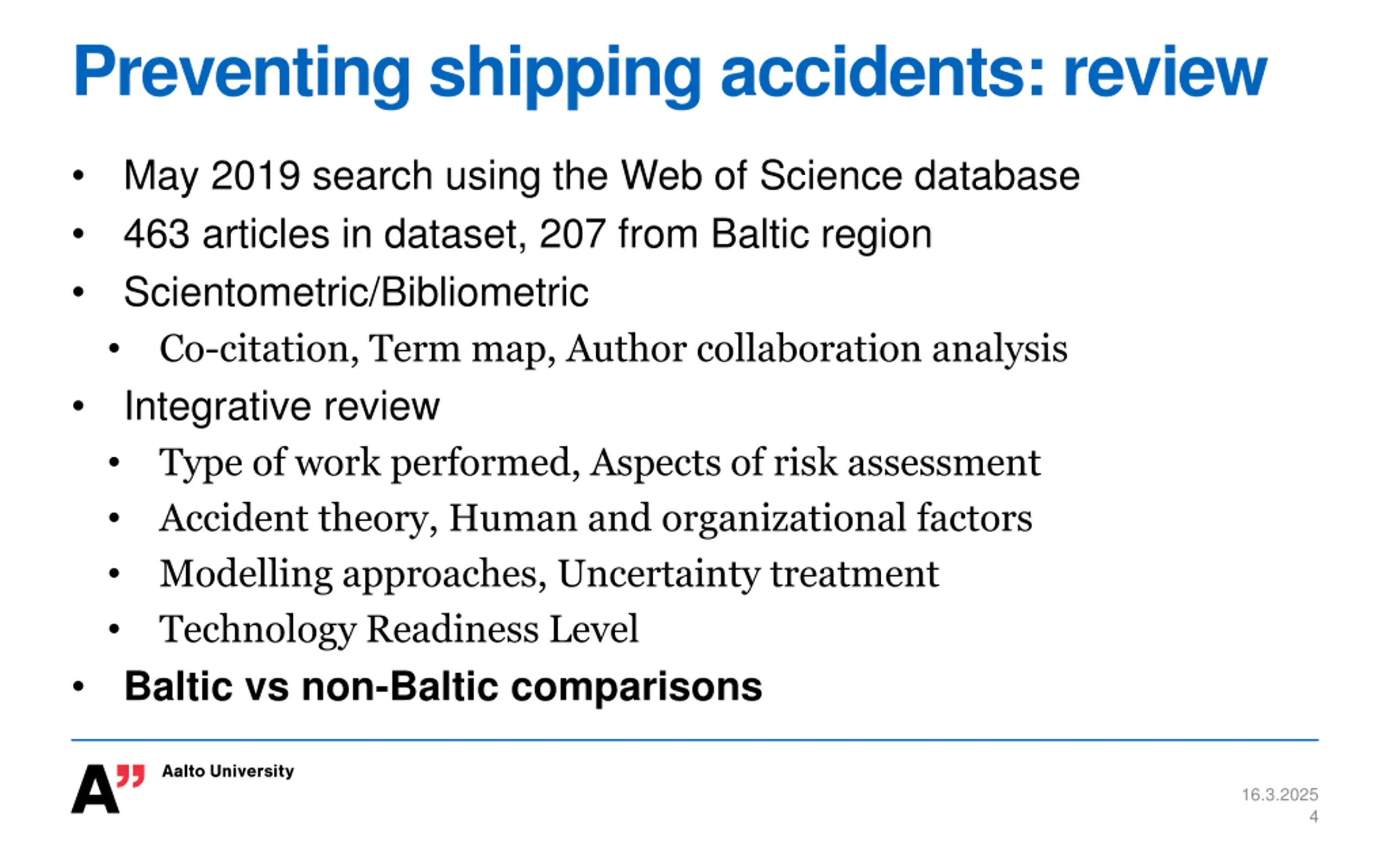Preventing shipping accidents: review May 2019 search using the Web of Science database 463 articles in dataset, 207 from Baltic region Scientometric/Bibliometric Co-citation, Term map, Author collaboration analysis Integrative review Type of work performed, Aspects of risk assessment Accident theory, Human and organizational factors Modelling approaches, Uncertainty treatment Technology Readiness Level Baltic vs non-Baltic comparisons 16.3.2025 4