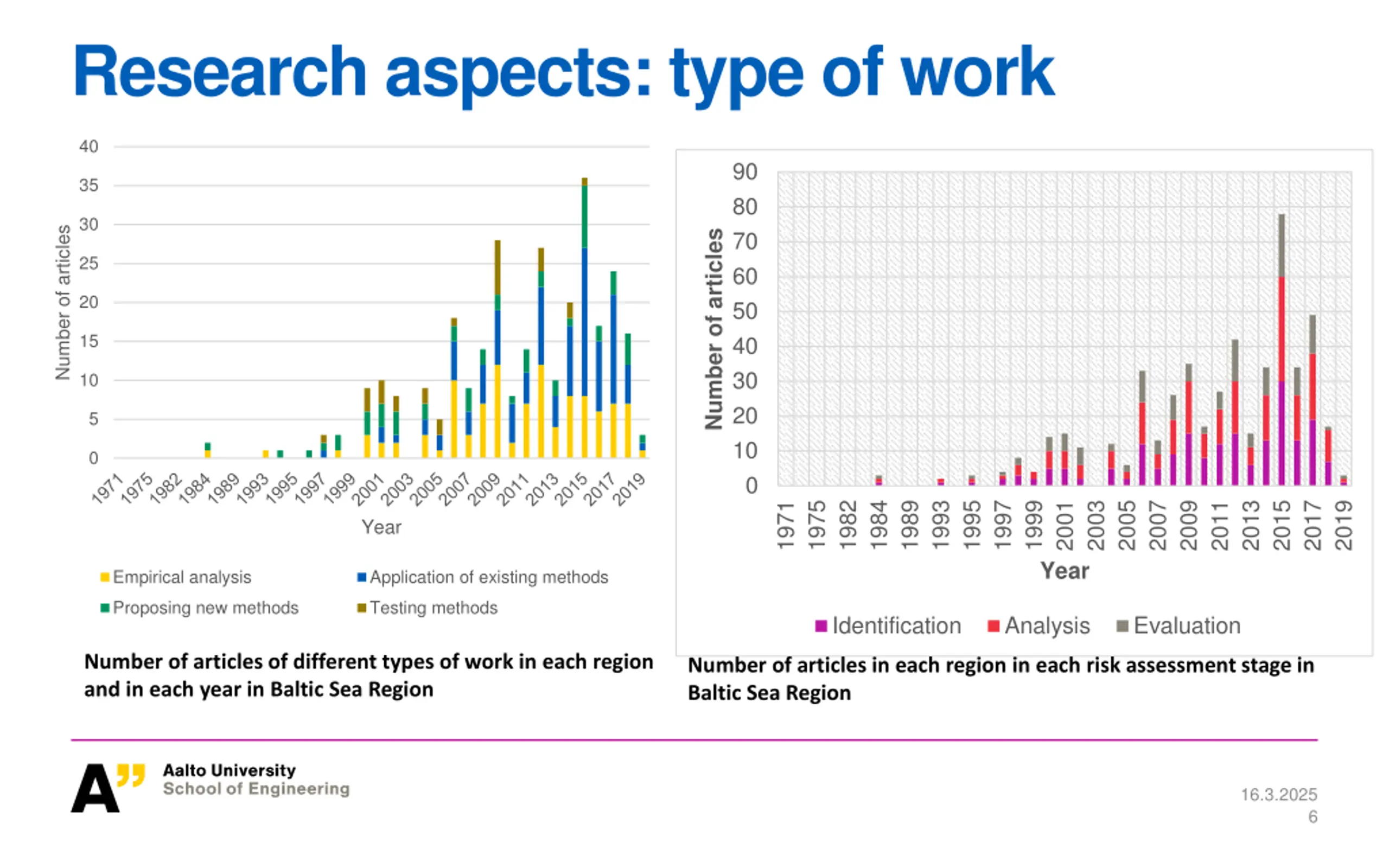 Analysis of scientific literature 50 45 40 35 Number of articles 30 25 20 15 10 5 0 Year BSR NB Output of the prevention-oriented waterway risk management research domain, by year BSR: Baltic Sea Region, NB: Non-Baltic 16.3.2025 5