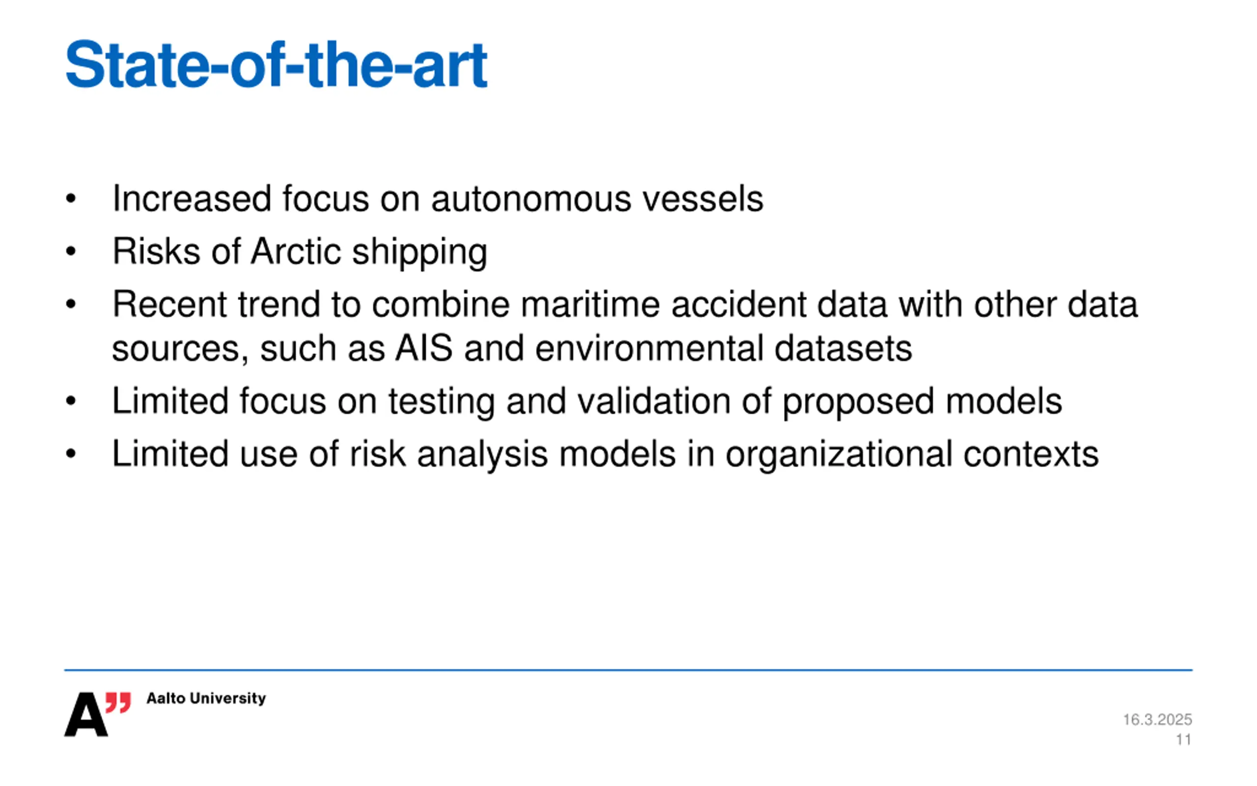 State-of-the-art Increased focus on autonomous vessels Risks of Arctic shipping Recent trend to combine maritime accident data with other data sources, such as AIS and environmental datasets Limited focus on testing and validation of proposed models Limited use of risk analysis models in organizational contexts 16.3.2025 11