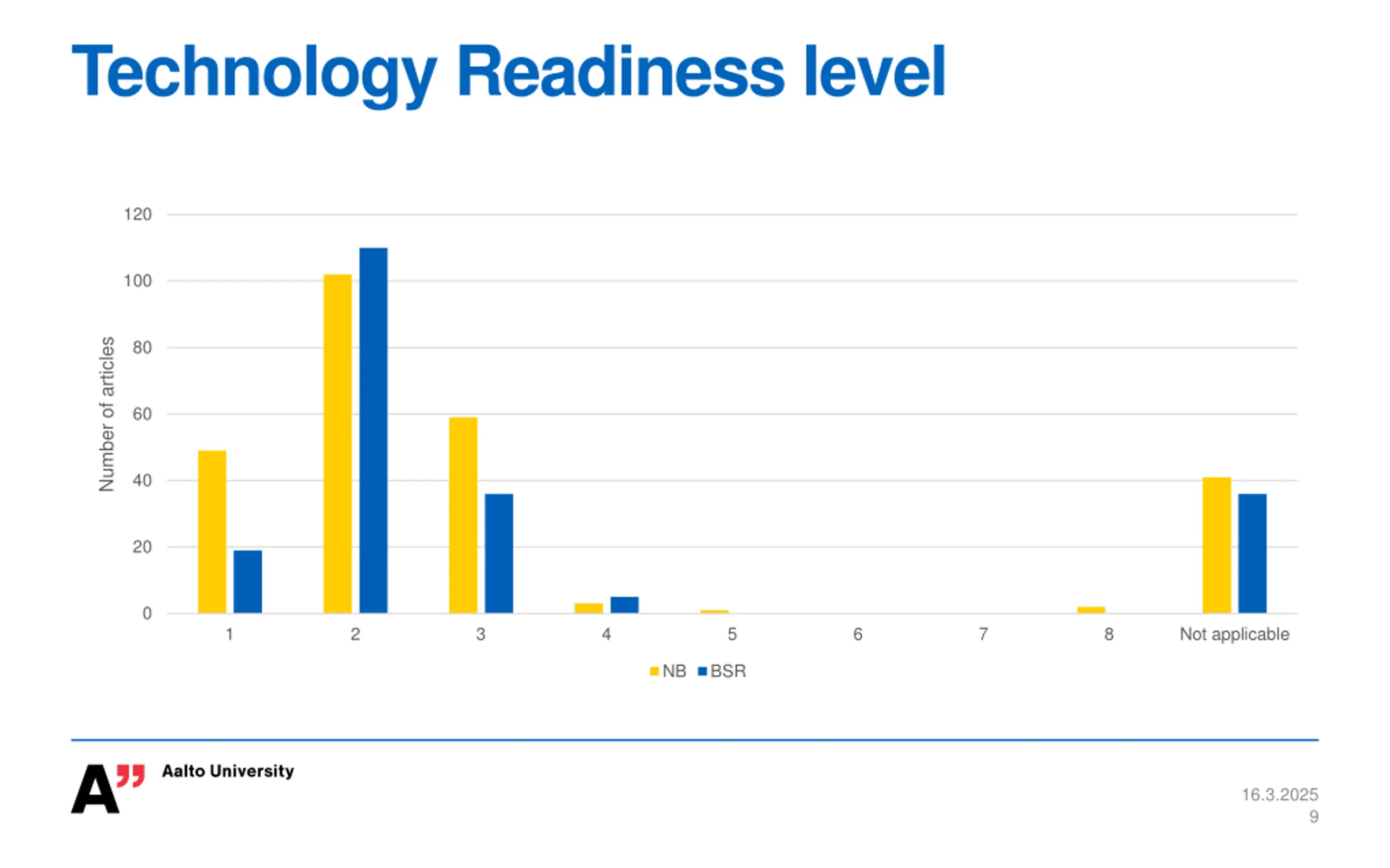 Technology Readiness level 120 100 Number of articles 80 60 40 20 0 1 2 3 4 5 6 7 8 Not applicable NB BSR 16.3.2025 9