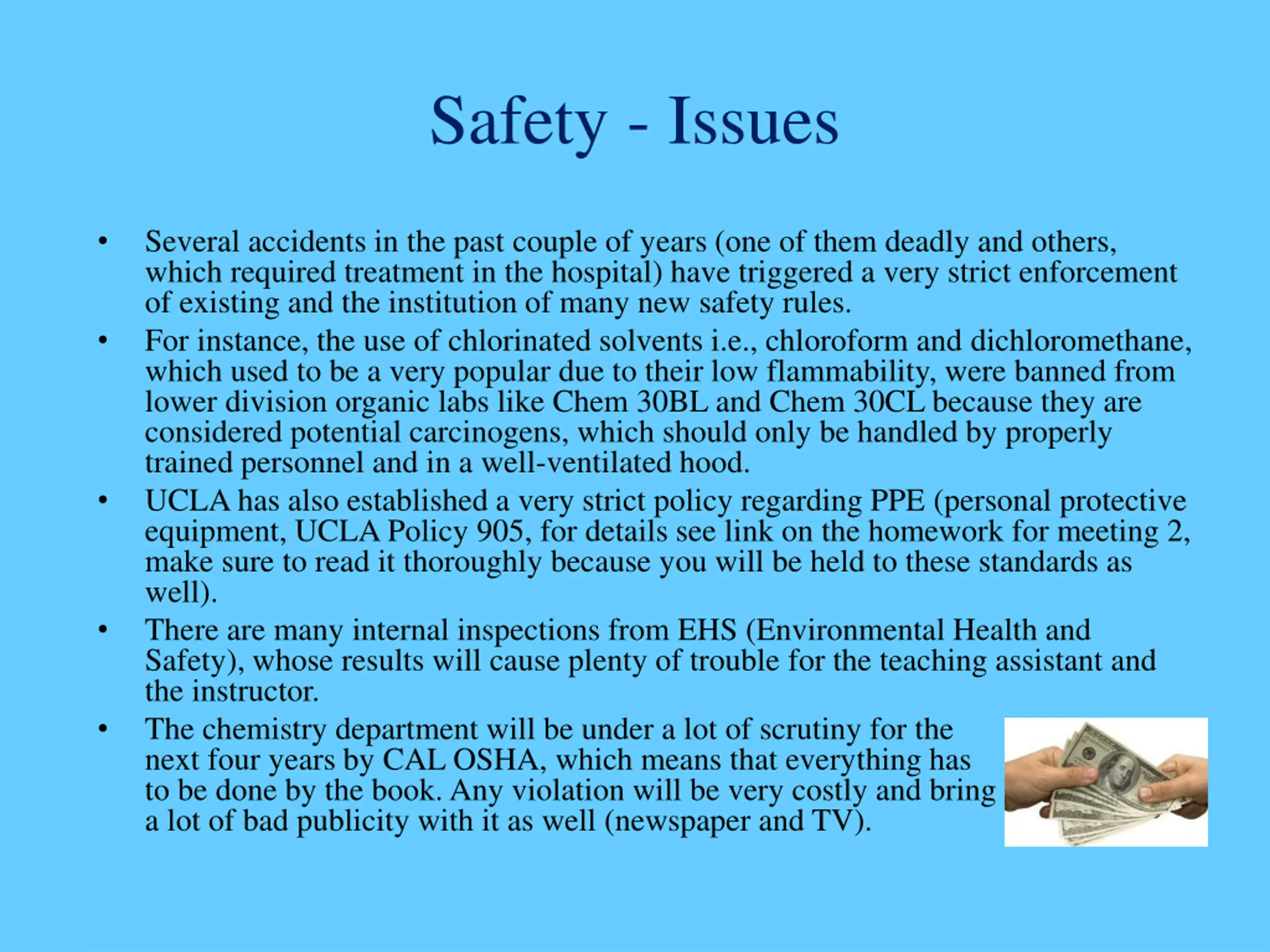Safety - Issues Several accidents in the past couple of years (one of them deadly and others, which required treatment in the hospital) have triggered a very strict enforcement of existing and the institution of many new safety rules. For instance, the use of chlorinated solvents i.e., chloroform and dichloromethane, which used to be a very popular due to their low flammability, were banned from lower division organic labs like Chem 30BL and Chem 30CL because they are considered potential carcinogens, which should only be handled by properly trained personnel and in a well-ventilated hood. UCLA has also established a very strict policy regarding PPE (personal protective equipment, UCLA Policy 905, for details see link on the homework for meeting 2, make sure to read it thoroughly because you will be held to these standards as well). There are many internal inspections from EHS (Environmental Health and Safety), whose results will cause plenty of trouble for the teaching assistant and the instructor. The chemistry department will be under a lot of scrutiny for the next four years by CAL OSHA, which means that everything has to be done by the book. Any violation will be very costly and bring a lot of bad publicity with it as well (newspaper and TV).