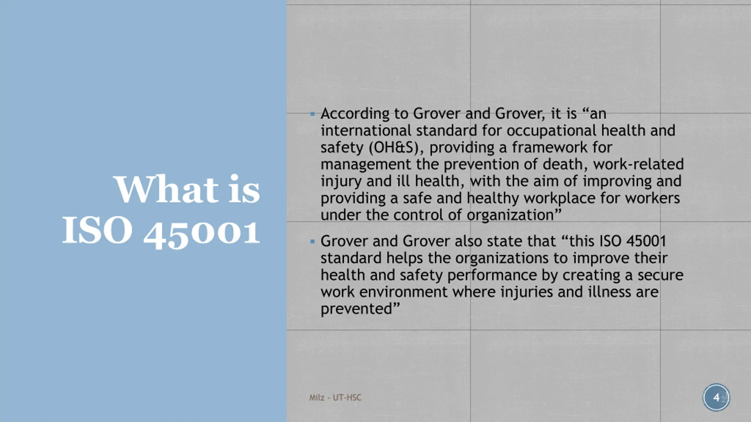 According to Grover and Grover, it is an international standard for occupational health and safety (OH&S), providing a framework for management the prevention of death, work-related injury and ill health, with the aim of improving and providing a safe and healthy workplace for workers under the control of organization What is ISO 45001 Grover and Grover also state that this ISO 45001 standard helps the organizations to improve their health and safety performance by creating a secure work environment where injuries and illness are prevented 4 Milz - UT-HSC