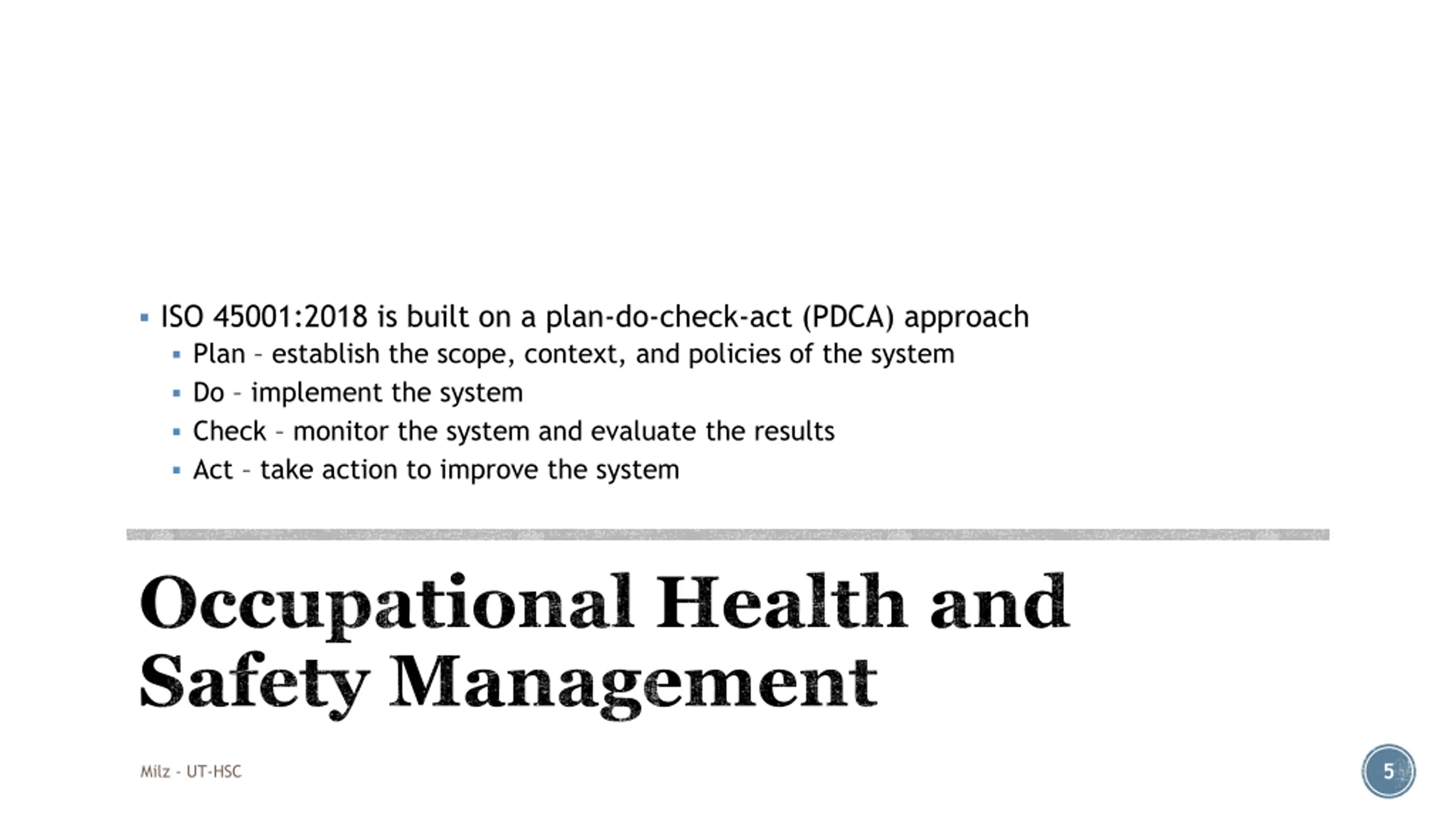 ISO 45001:2018 is built on a plan-do-check-act (PDCA) approach Plan establish the scope, context, and policies of the system Do implement the system Check monitor the system and evaluate the results Act take action to improve the system Occupational Health and Safety Management 5 Milz - UT-HSC