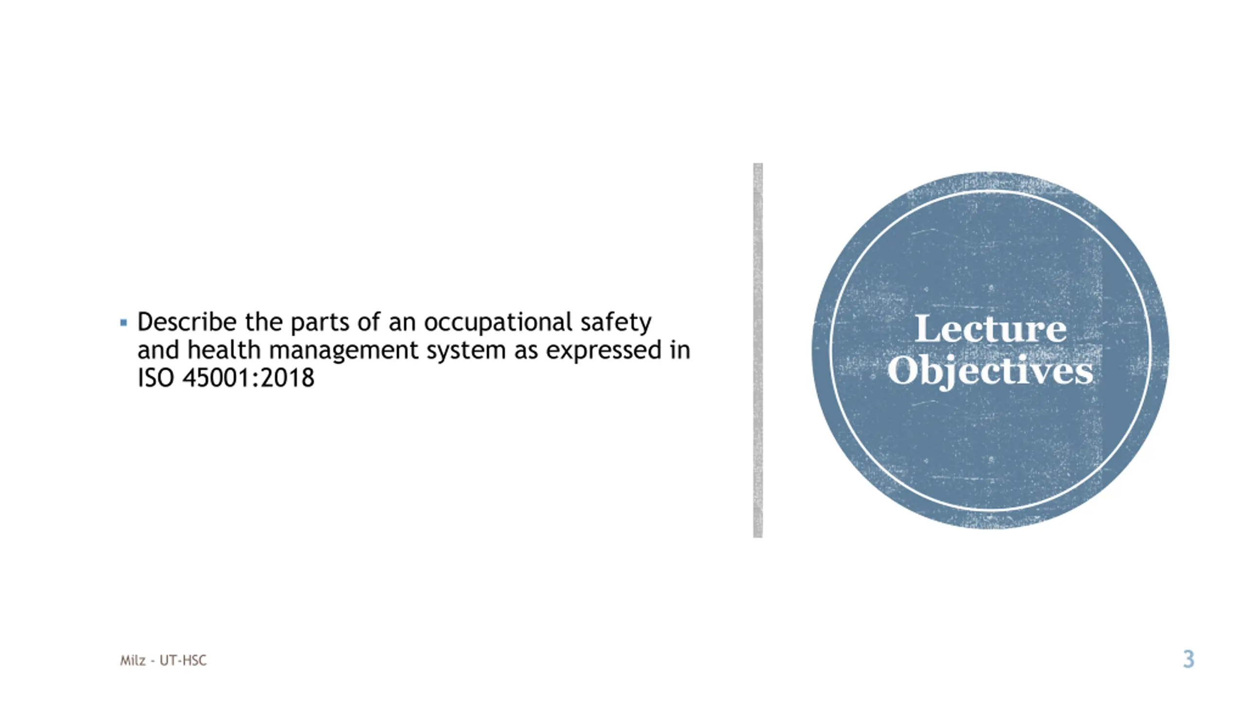 Lecture Objectives Describe the parts of an occupational safety and health management system as expressed in ISO 45001:2018 3 Milz - UT-HSC