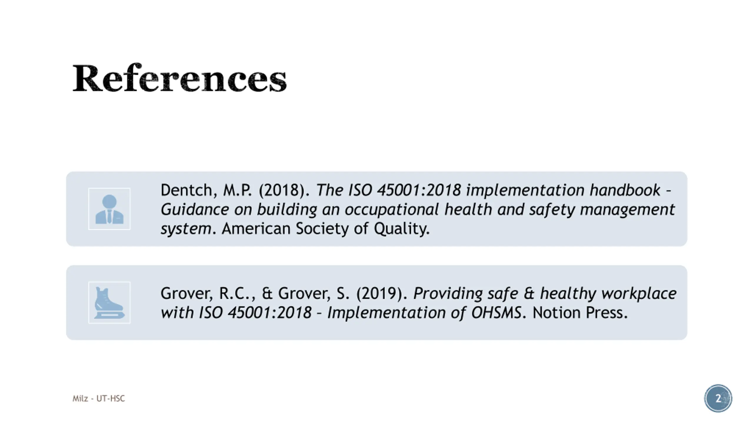 References Dentch, M.P. (2018). The ISO 45001:2018 implementation handbook Guidance on building an occupational health and safety management system. American Society of Quality. Grover, R.C., & Grover, S. (2019). Providing safe & healthy workplace with ISO 45001:2018 Implementation of OHSMS. Notion Press. 2 Milz - UT-HSC