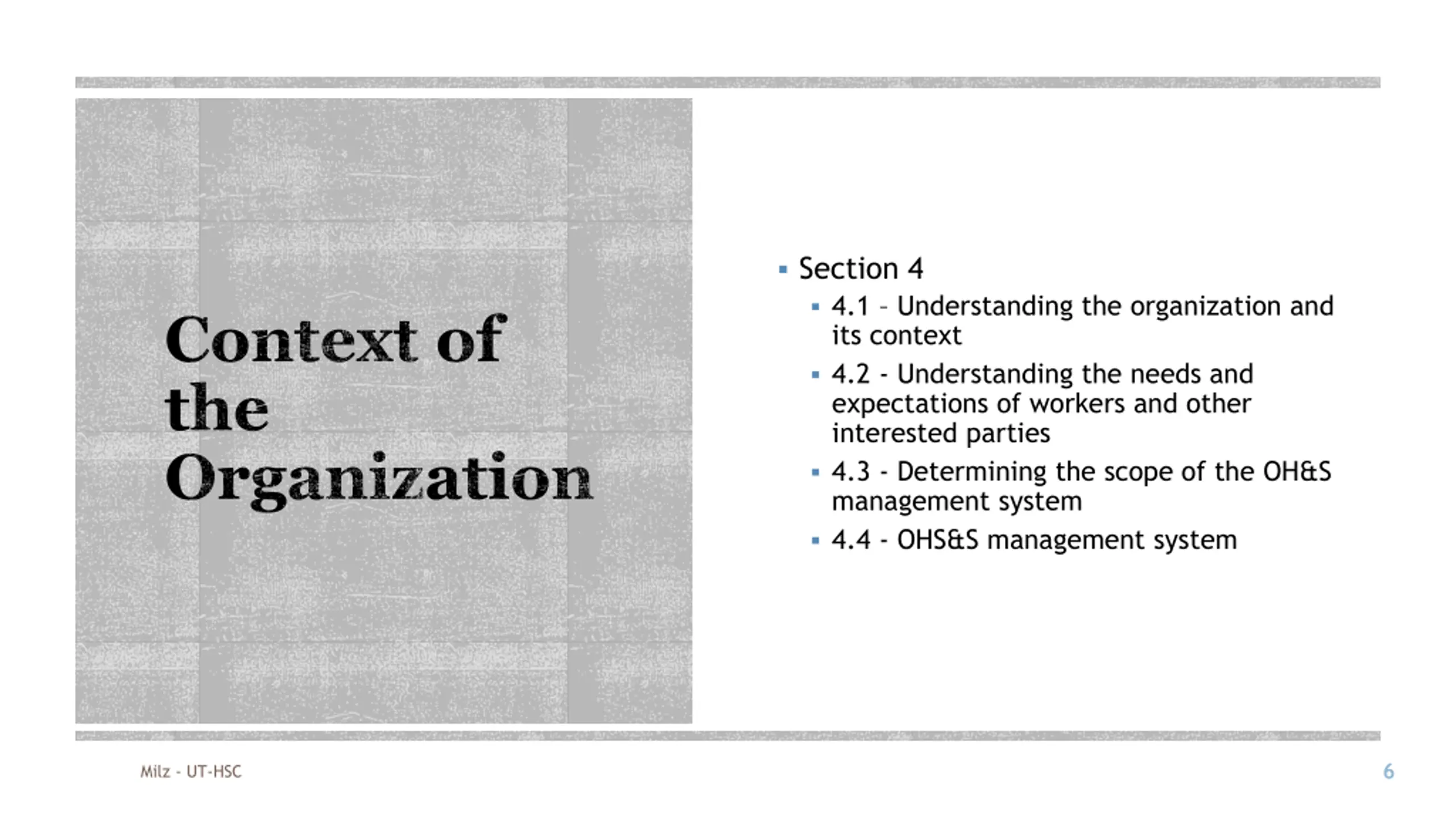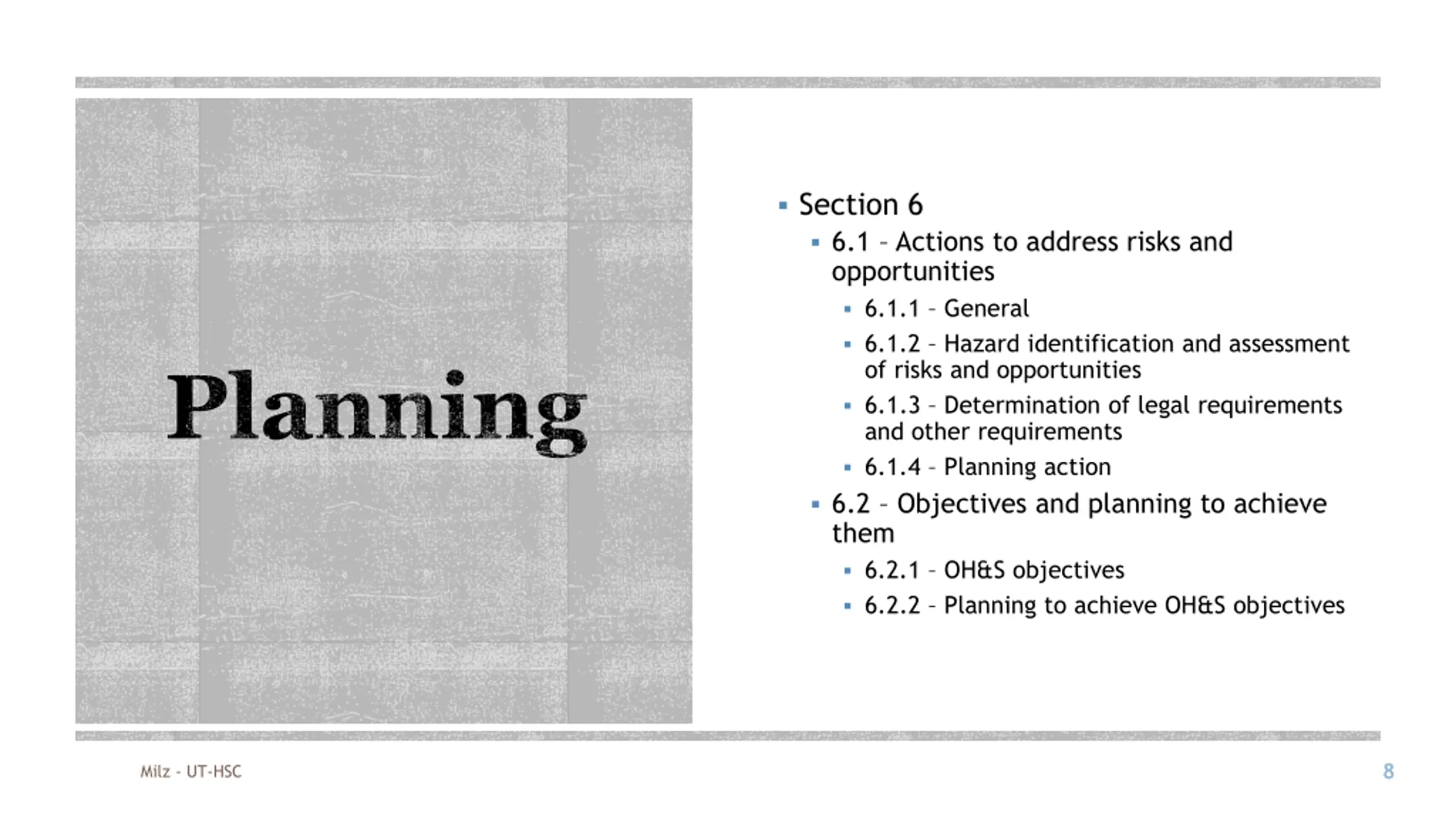Section 6 6.1 Actions to address risks and opportunities 6.1.1 General 6.1.2 Hazard identification and assessment of risks and opportunities 6.1.3 Determination of legal requirements and other requirements 6.1.4 Planning action 6.2 Objectives and planning to achieve them 6.2.1 OH&S objectives 6.2.2 Planning to achieve OH&S objectives Planning 8 Milz - UT-HSC