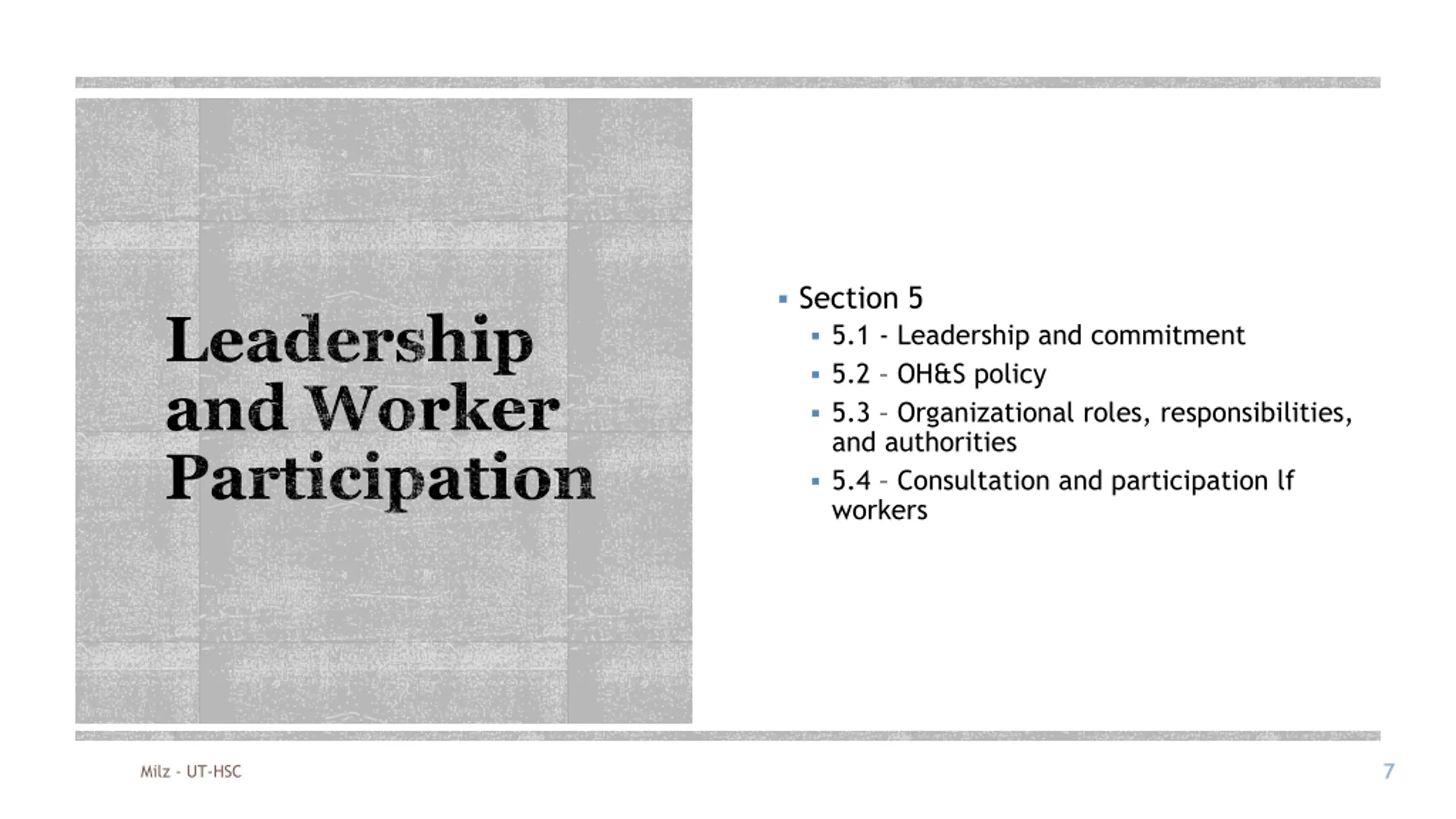 Section 5 5.1 - Leadership and commitment 5.2 OH&S policy 5.3 Organizational roles, responsibilities, and authorities 5.4 Consultation and participation lf workers Leadership and Worker Participation 7 Milz - UT-HSC