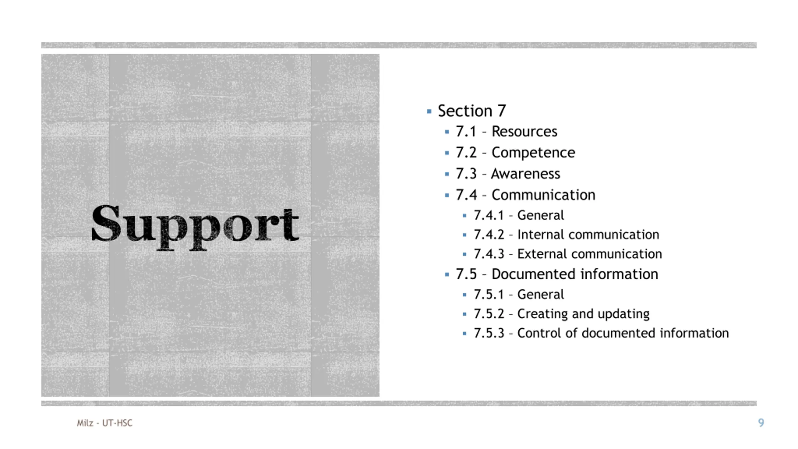 Section 7 7.1 Resources 7.2 Competence 7.3 Awareness 7.4 Communication 7.4.1 General 7.4.2 Internal communication 7.4.3 External communication 7.5 Documented information 7.5.1 General 7.5.2 Creating and updating 7.5.3 Control of documented information Support 9 Milz - UT-HSC