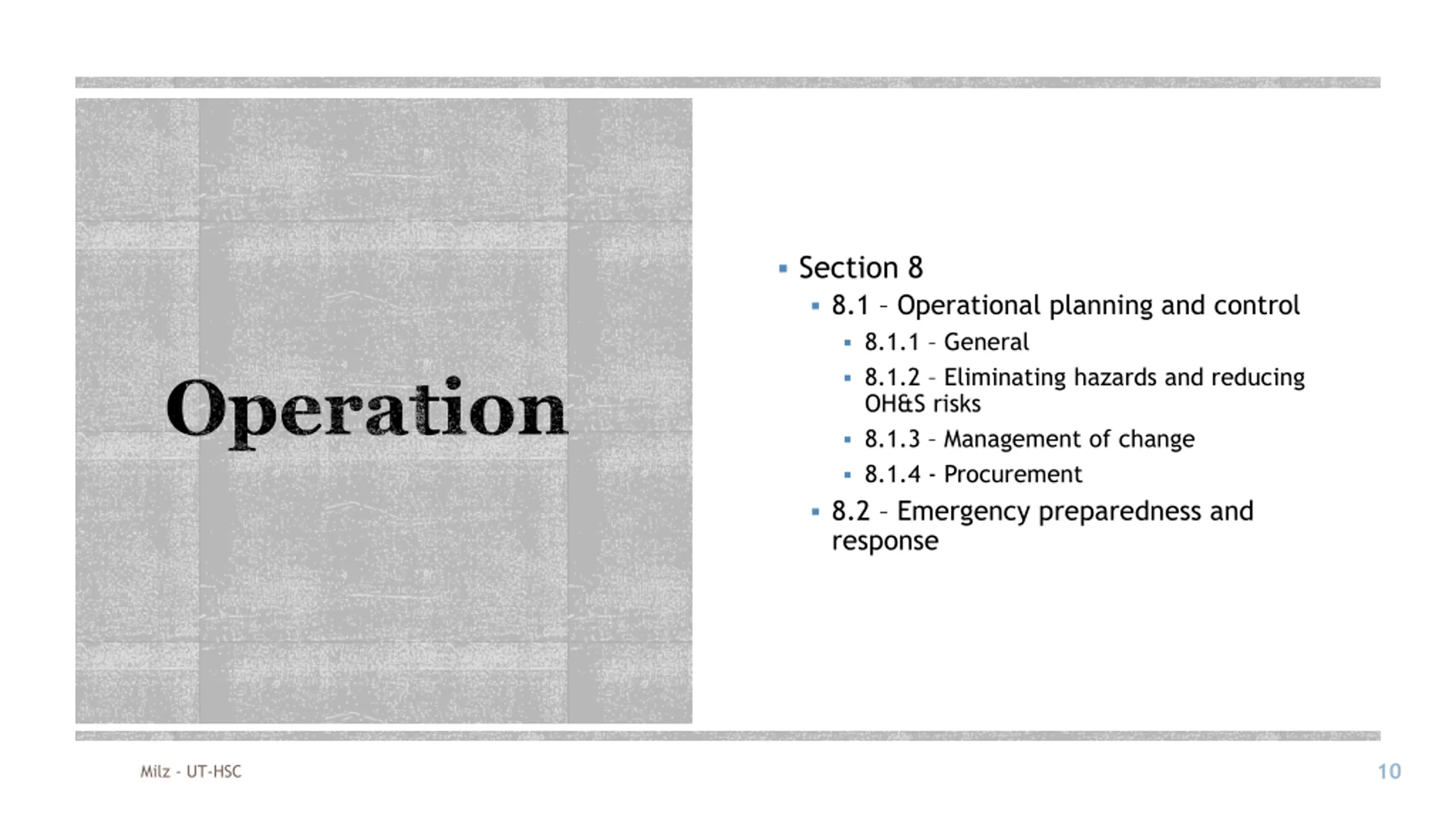 Section 8 8.1 Operational planning and control 8.1.1 General 8.1.2 Eliminating hazards and reducing OH&S risks 8.1.3 Management of change 8.1.4 - Procurement 8.2 Emergency preparedness and response Operation 10 Milz - UT-HSC
