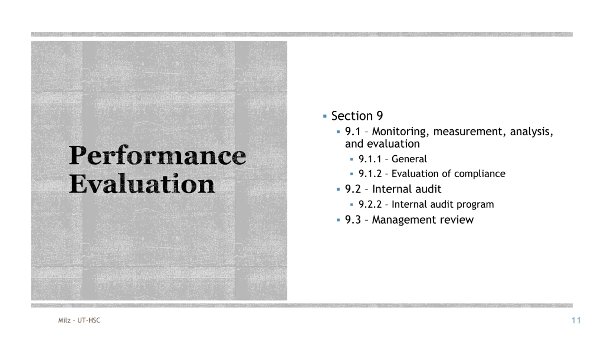 Section 9 9.1 Monitoring, measurement, analysis, and evaluation 9.1.1 General 9.1.2 Evaluation of compliance 9.2 Internal audit 9.2.2 Internal audit program 9.3 Management review Performance Evaluation 11 Milz - UT-HSC