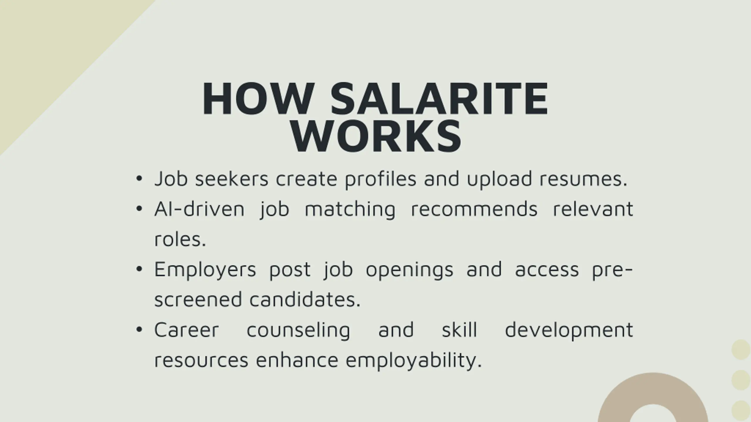 HOW SALARITE WORKS Job seekers create profiles and upload resumes. AI-driven job matching recommends relevant roles. Employers post job openings and access pre- screened candidates. Career counseling and resources enhance employability. skill development