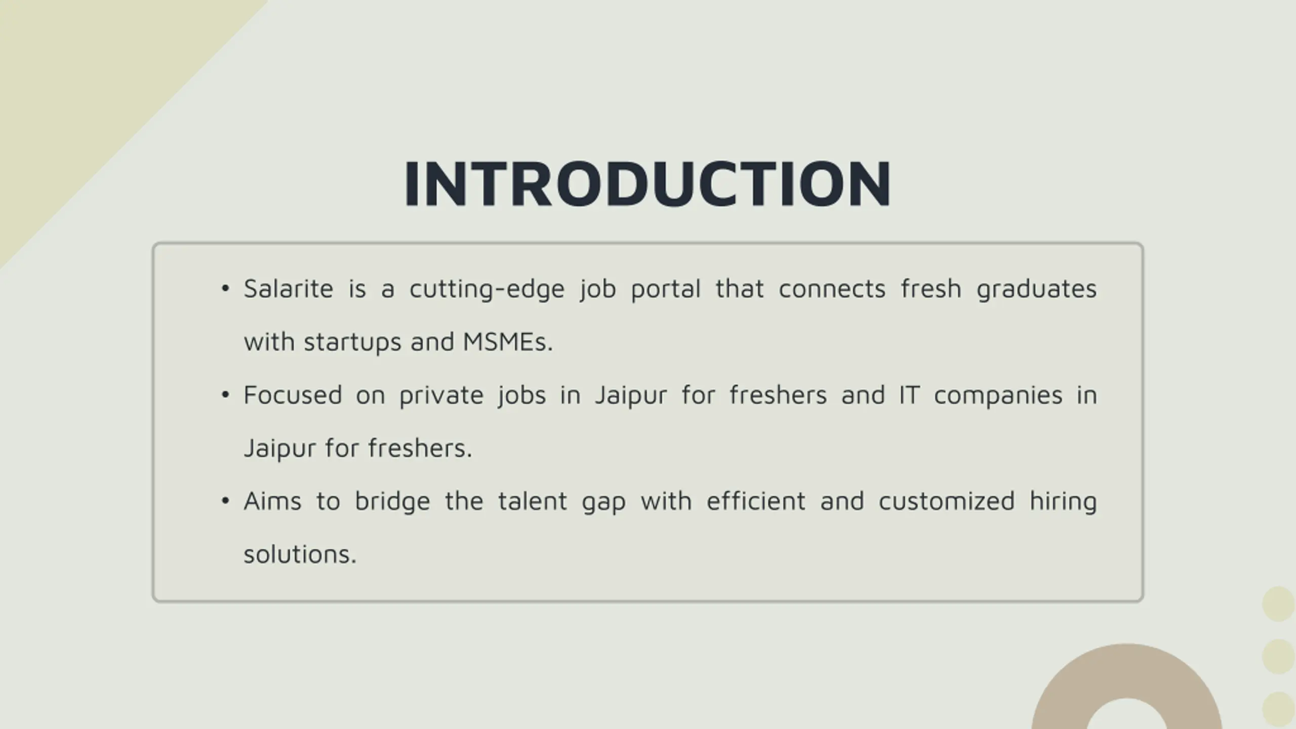 INTRODUCTION Salarite is a cutting-edge job portal that connects fresh graduates with startups and MSMEs. Focused on private jobs in Jaipur for freshers and IT companies in Jaipur for freshers. Aims to bridge the talent gap with efficient and customized hiring solutions.