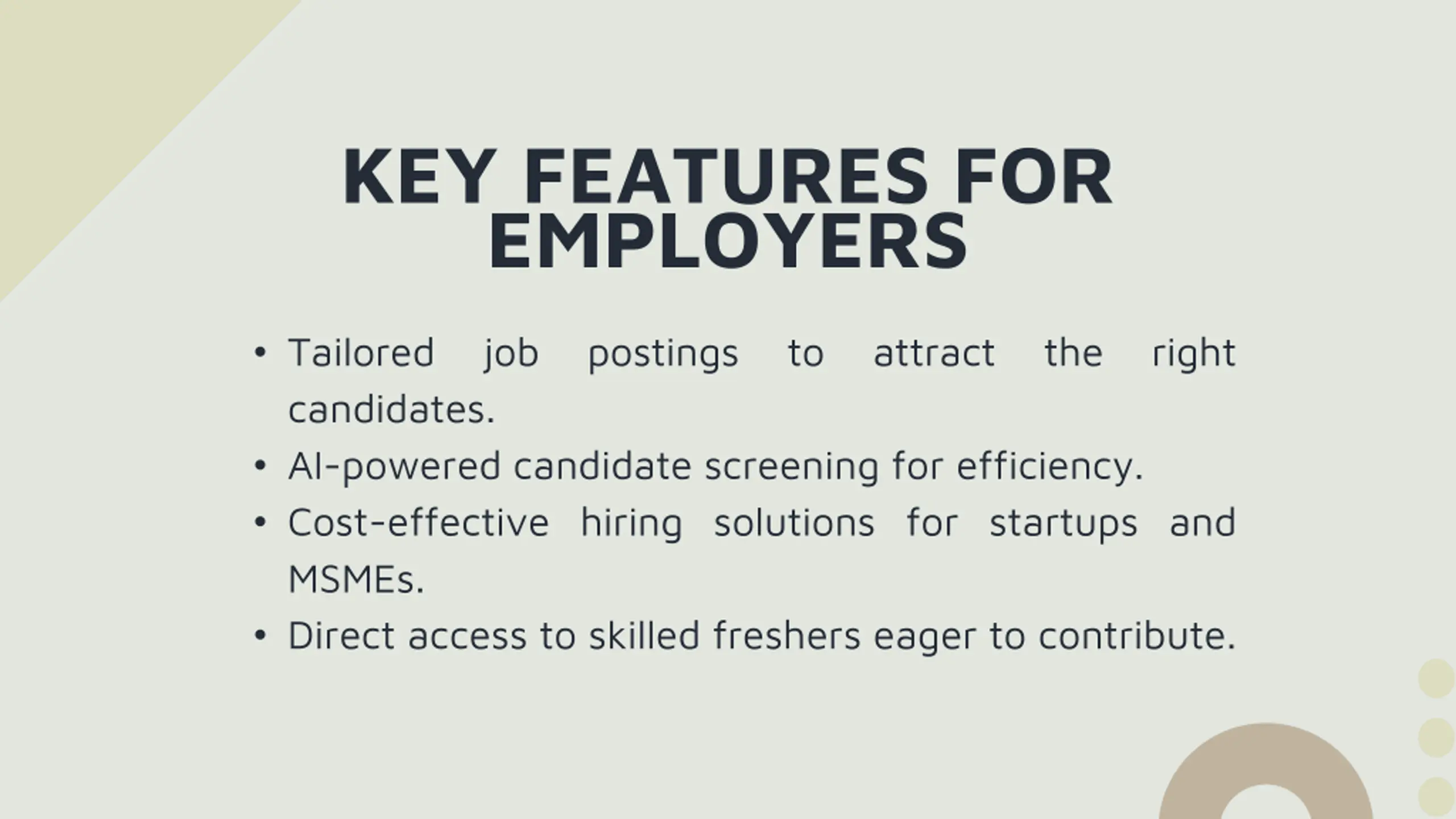 KEY FEATURES FOR EMPLOYERS Tailored job postings to attract the right candidates. AI-powered candidate screening for efficiency. Cost-effective hiring solutions for startups and MSMEs. Direct access to skilled freshers eager to contribute.