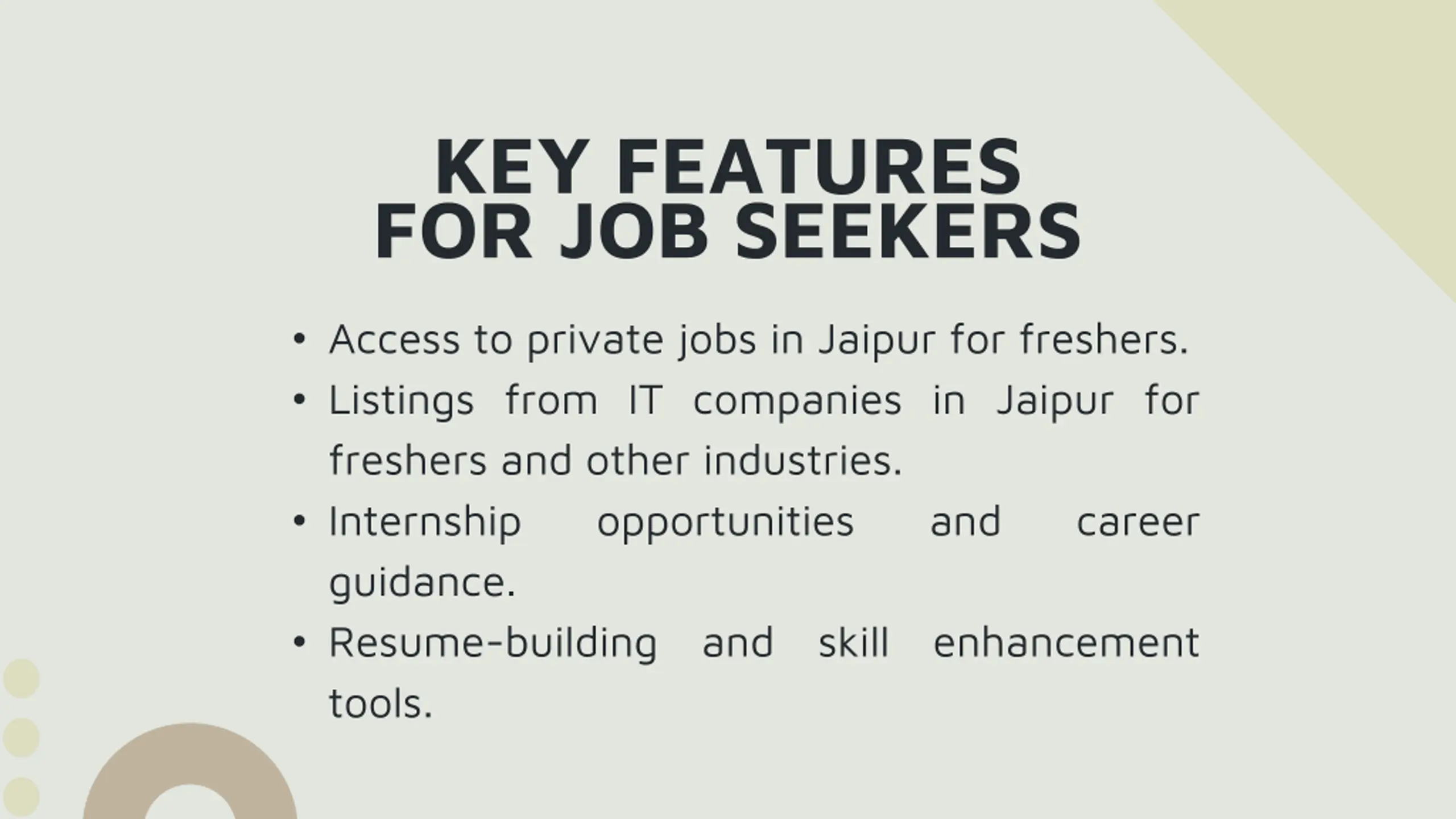 KEY FEATURES FOR JOB SEEKERS Access to private jobs in Jaipur for freshers. Listings from IT companies in Jaipur for freshers and other industries. Internship opportunities guidance. Resume-building and skill enhancement tools. and career