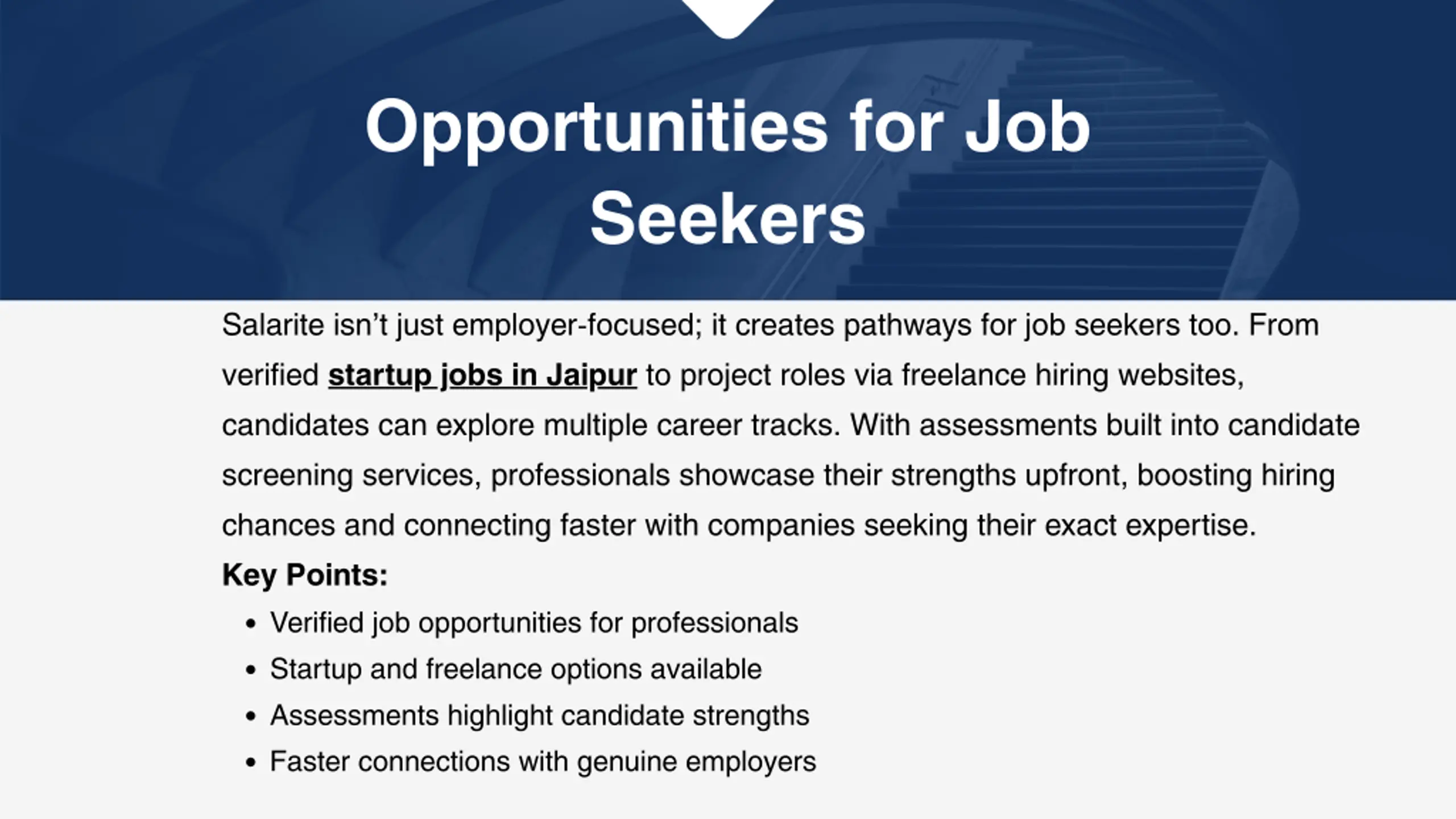 Opportunities for Job Seekers Salarite isn t just employer-focused; it creates pathways for job seekers too. From verified startup jobs in Jaipur to project roles via freelance hiring websites, candidates can explore multiple career tracks. With assessments built into candidate screening services, professionals showcase their strengths upfront, boosting hiring chances and connecting faster with companies seeking their exact expertise. Key Points: Verified job opportunities for professionals Startup and freelance options available Assessments highlight candidate strengths Faster connections with genuine employers