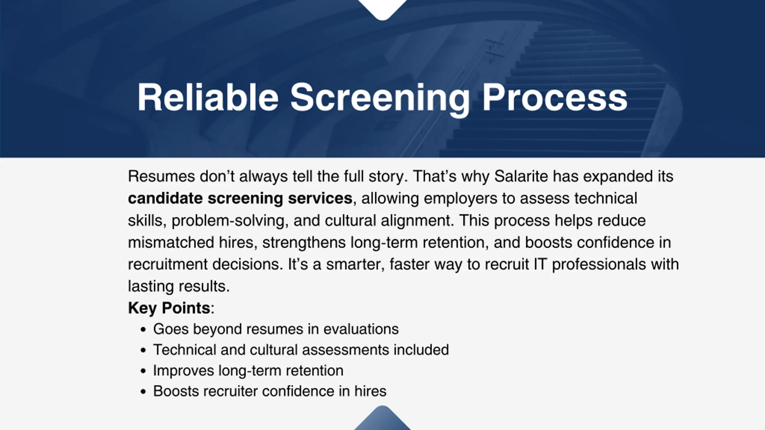 Reliable Screening Process Resumes don t always tell the full story. That s why Salarite has expanded its candidate screening services, allowing employers to assess technical skills, problem-solving, and cultural alignment. This process helps reduce mismatched hires, strengthens long-term retention, and boosts confidence in recruitment decisions. It s a smarter, faster way to recruit IT professionals with lasting results. Key Points: Goes beyond resumes in evaluations Technical and cultural assessments included Improves long-term retention Boosts recruiter confidence in hires