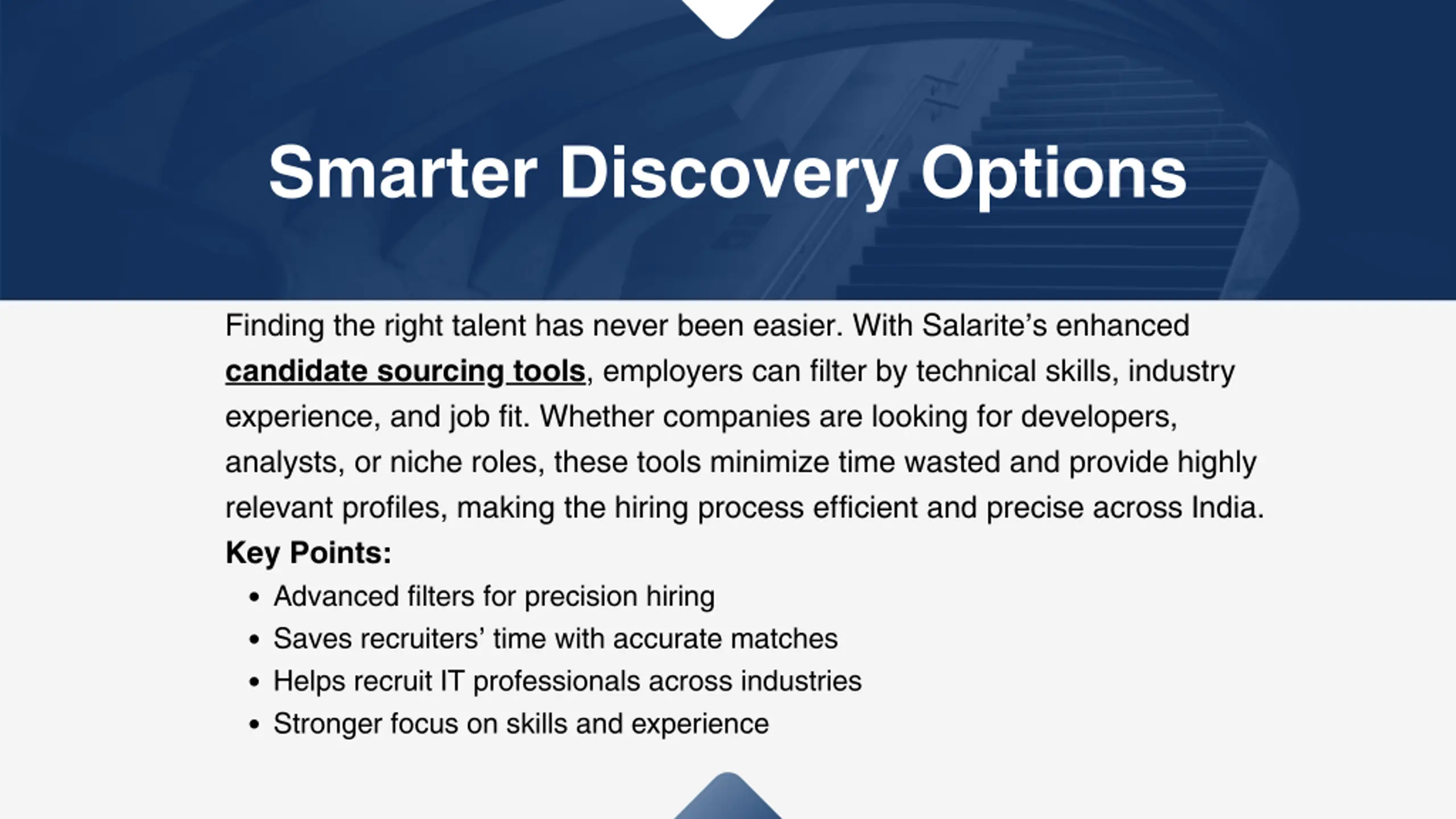 Smarter Discovery Options Finding the right talent has never been easier. With Salarite s enhanced candidate sourcing tools, employers can filter by technical skills, industry experience, and job fit. Whether companies are looking for developers, analysts, or niche roles, these tools minimize time wasted and provide highly relevant profiles, making the hiring process efficient and precise across India. Key Points: Advanced filters for precision hiring Saves recruiters time with accurate matches Helps recruit IT professionals across industries Stronger focus on skills and experience