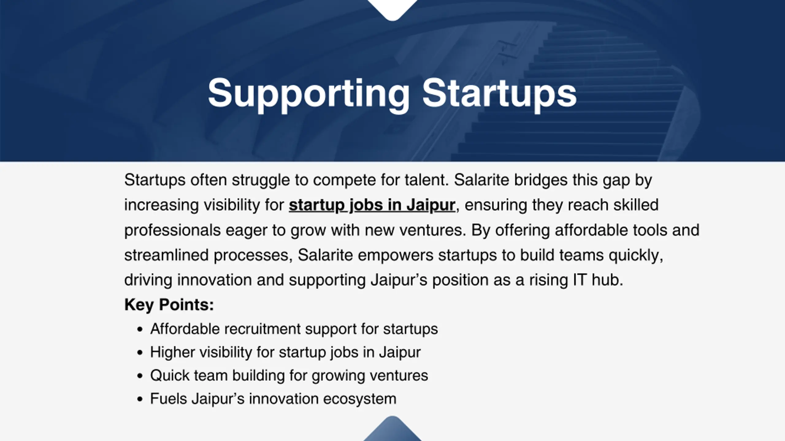 Supporting Startups Startups often struggle to compete for talent. Salarite bridges this gap by increasing visibility for startup jobs in Jaipur, ensuring they reach skilled professionals eager to grow with new ventures. By offering affordable tools and streamlined processes, Salarite empowers startups to build teams quickly, driving innovation and supporting Jaipur s position as a rising IT hub. Key Points: Affordable recruitment support for startups Higher visibility for startup jobs in Jaipur Quick team building for growing ventures Fuels Jaipur s innovation ecosystem