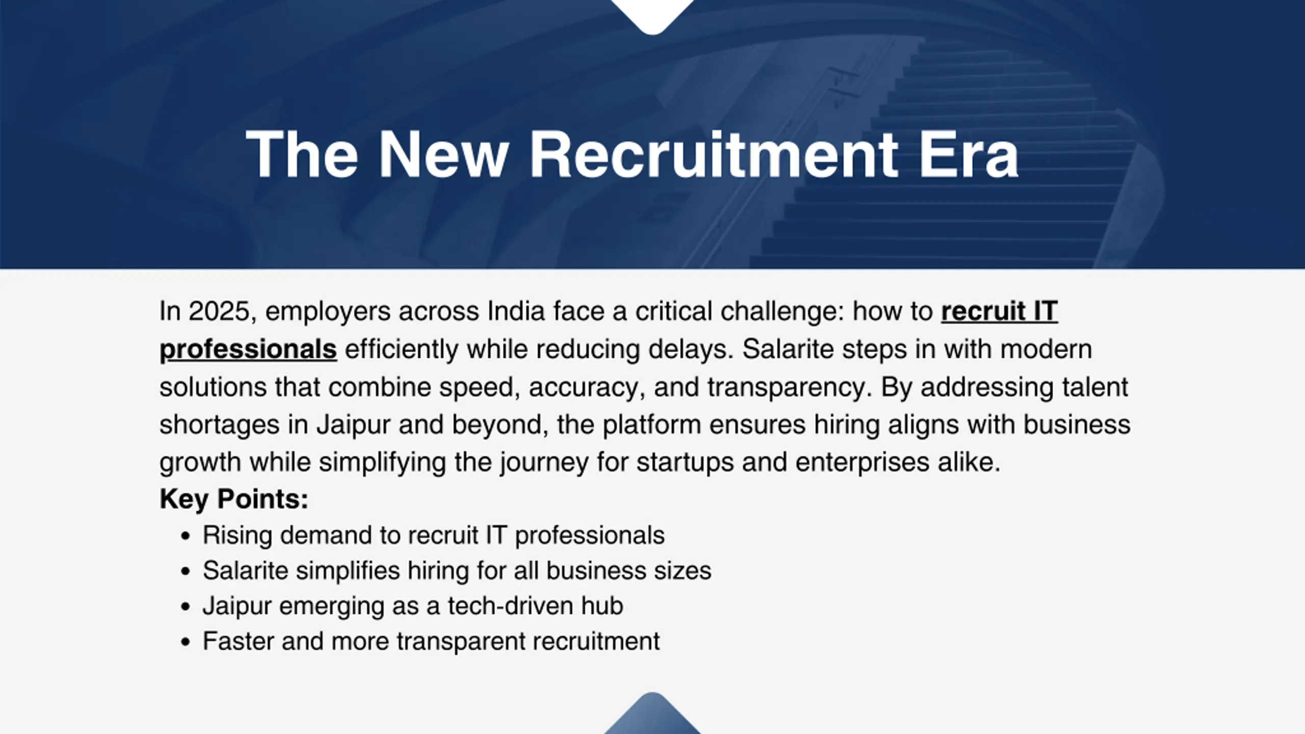 The New Recruitment Era In 2025, employers across India face a critical challenge: how to recruit IT professionals efficiently while reducing delays. Salarite steps in with modern solutions that combine speed, accuracy, and transparency. By addressing talent shortages in Jaipur and beyond, the platform ensures hiring aligns with business growth while simplifying the journey for startups and enterprises alike. Key Points: Rising demand to recruit IT professionals Salarite simplifies hiring for all business sizes Jaipur emerging as a tech-driven hub Faster and more transparent recruitment