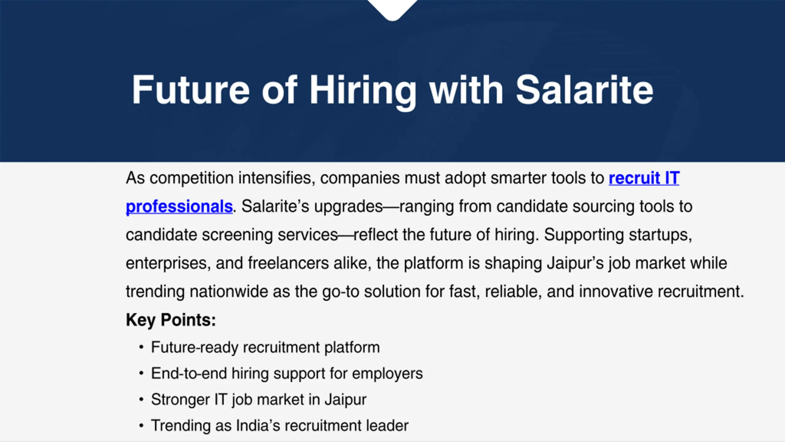 The demand for skilled tech talent is at its peak, and startups in Jaipur are looking for smarter ways to recruit IT professionals. Salarite offers advanced hiring tools that make it easier for companies to connect with top developers, engineers, and