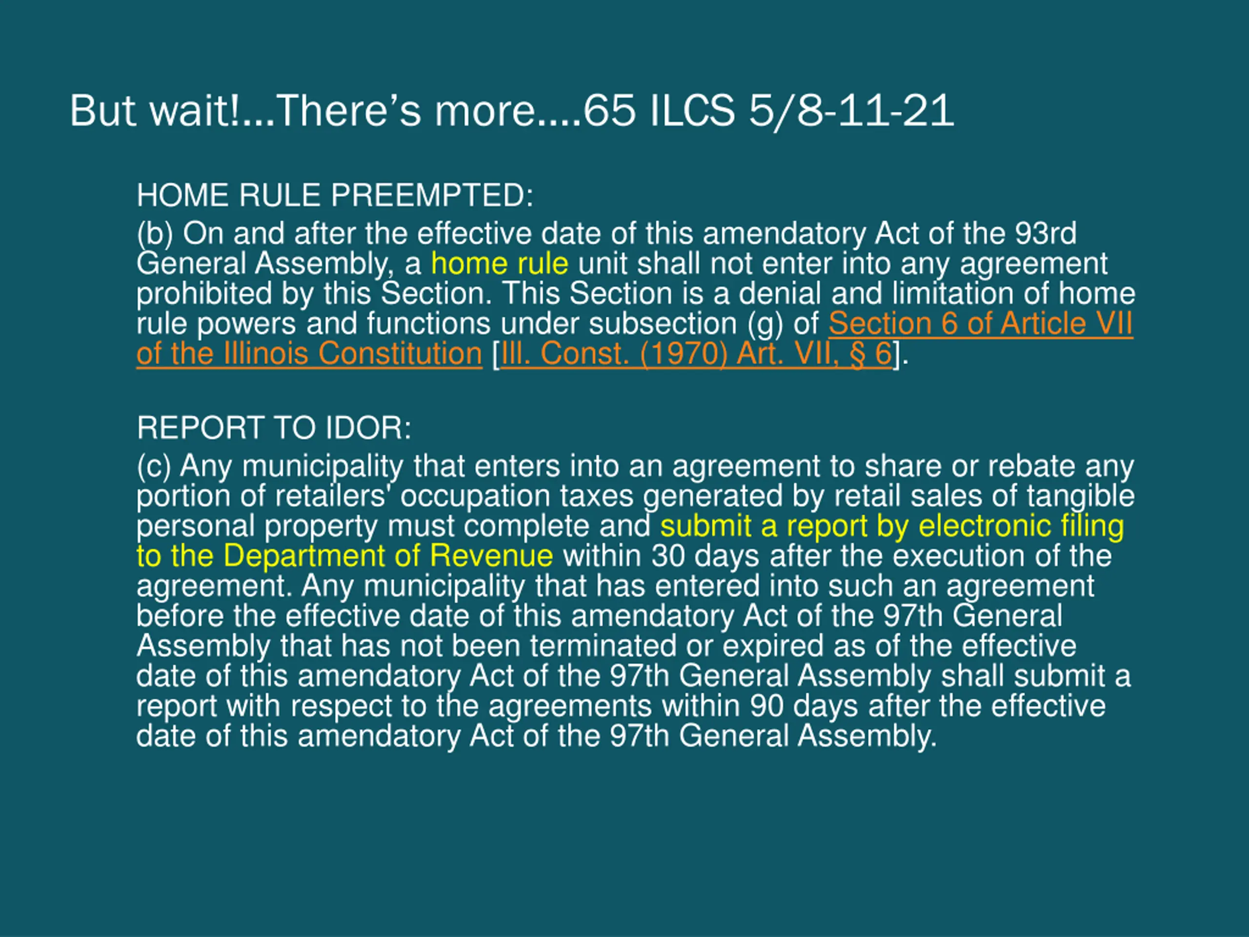 But wait!...Theres more.65 ILCS 5/8-11-21 HOME RULE PREEMPTED: (b) On and after the effective date of this amendatory Act of the 93rd General Assembly, a home rule unit shall not enter into any agreement prohibited by this Section. This Section is a denial and limitation of home rule powers and functions under subsection (g) of Section 6 of Article VII of the Illinois Constitution [Ill. Const. (1970) Art. VII, 6]. REPORT TO IDOR: (c) Any municipality that enters into an agreement to share or rebate any portion of retailers' occupation taxes generated by retail sales of tangible personal property must complete and submit a report by electronic filing to the Department of Revenue within 30 days after the execution of the agreement. Any municipality that has entered into such an agreement before the effective date of this amendatory Act of the 97th General Assembly that has not been terminated or expired as of the effective date of this amendatory Act of the 97th General Assembly shall submit a report with respect to the agreements within 90 days after the effective date of this amendatory Act of the 97th General Assembly.