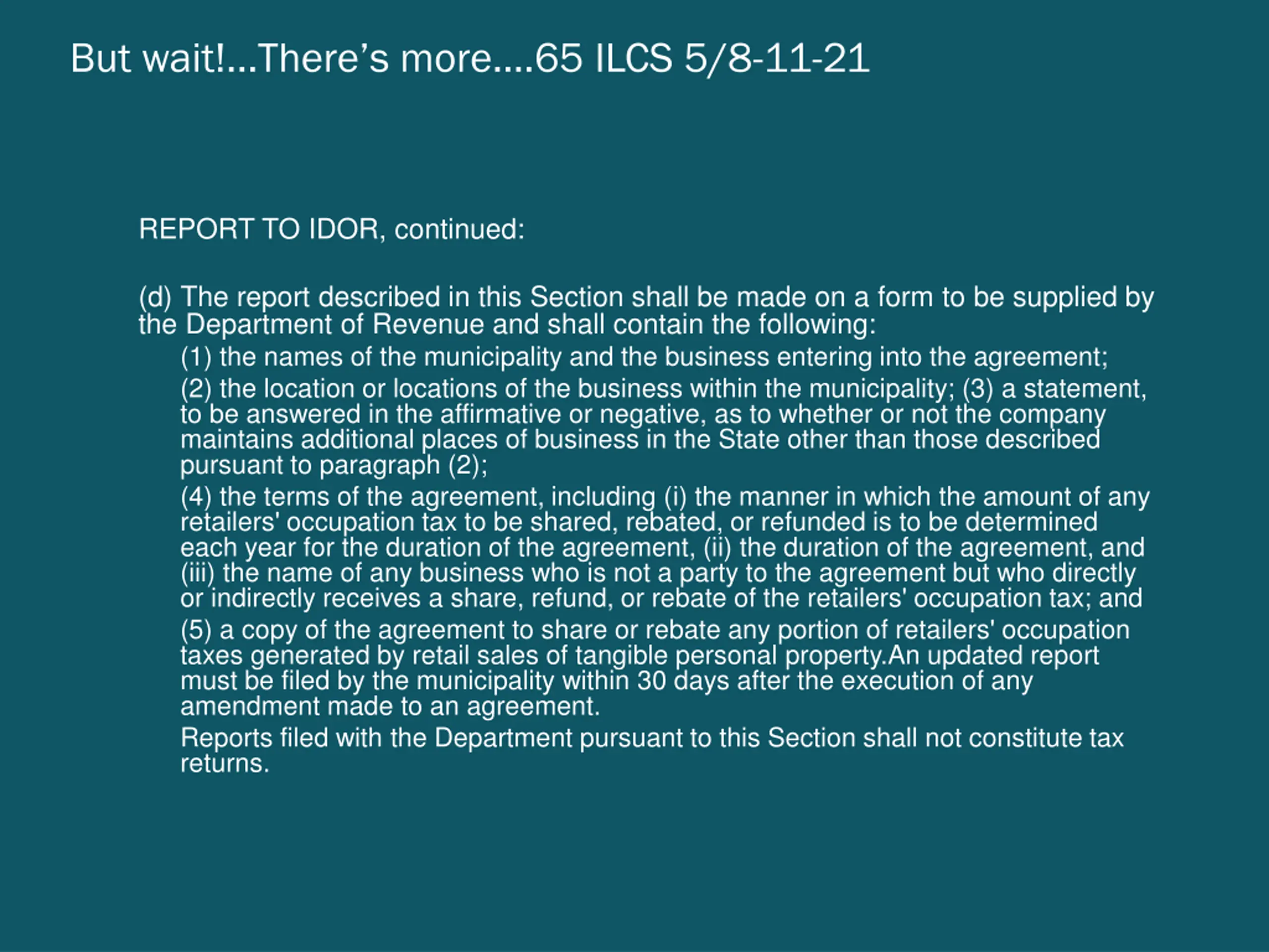 But wait!...Theres more.65 ILCS 5/8-11-21 REPORT TO IDOR, continued: (d) The report described in this Section shall be made on a form to be supplied by the Department of Revenue and shall contain the following: (1) the names of the municipality and the business entering into the agreement; (2) the location or locations of the business within the municipality; (3) a statement, to be answered in the affirmative or negative, as to whether or not the company maintains additional places of business in the State other than those described pursuant to paragraph (2); (4) the terms of the agreement, including (i) the manner in which the amount of any retailers' occupation tax to be shared, rebated, or refunded is to be determined each year for the duration of the agreement, (ii) the duration of the agreement, and (iii) the name of any business who is not a party to the agreement but who directly or indirectly receives a share, refund, or rebate of the retailers' occupation tax; and (5) a copy of the agreement to share or rebate any portion of retailers' occupation taxes generated by retail sales of tangible personal property.An updated report must be filed by the municipality within 30 days after the execution of any amendment made to an agreement. Reports filed with the Department pursuant to this Section shall not constitute tax returns.