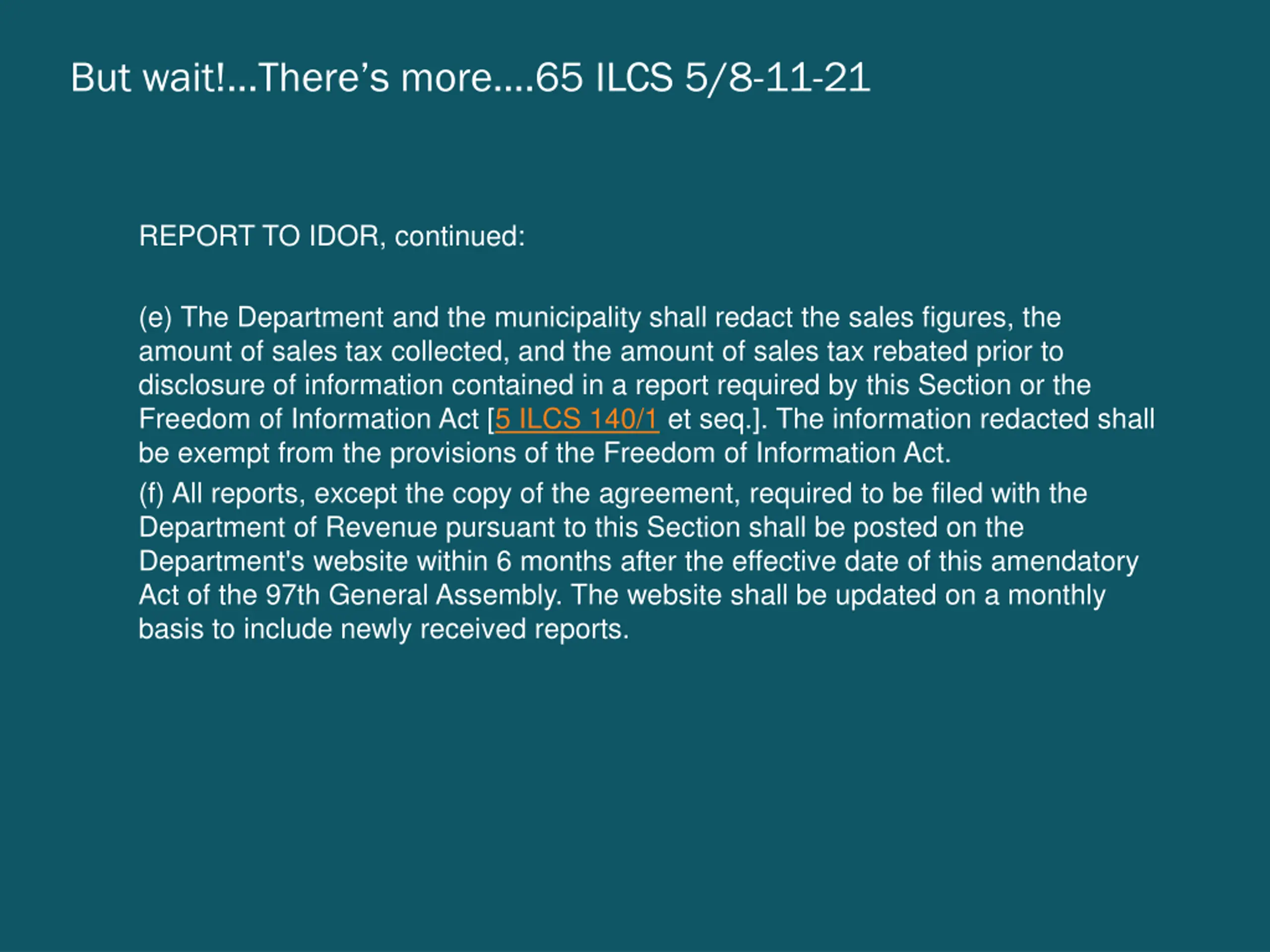 But wait!...Theres more.65 ILCS 5/8-11-21 REPORT TO IDOR, continued: (e) The Department and the municipality shall redact the sales figures, the amount of sales tax collected, and the amount of sales tax rebated prior to disclosure of information contained in a report required by this Section or the Freedom of Information Act [5 ILCS 140/1 et seq.]. The information redacted shall be exempt from the provisions of the Freedom of Information Act. (f) All reports, except the copy of the agreement, required to be filed with the Department of Revenue pursuant to this Section shall be posted on the Department's website within 6 months after the effective date of this amendatory Act of the 97th General Assembly. The website shall be updated on a monthly basis to include newly received reports.
