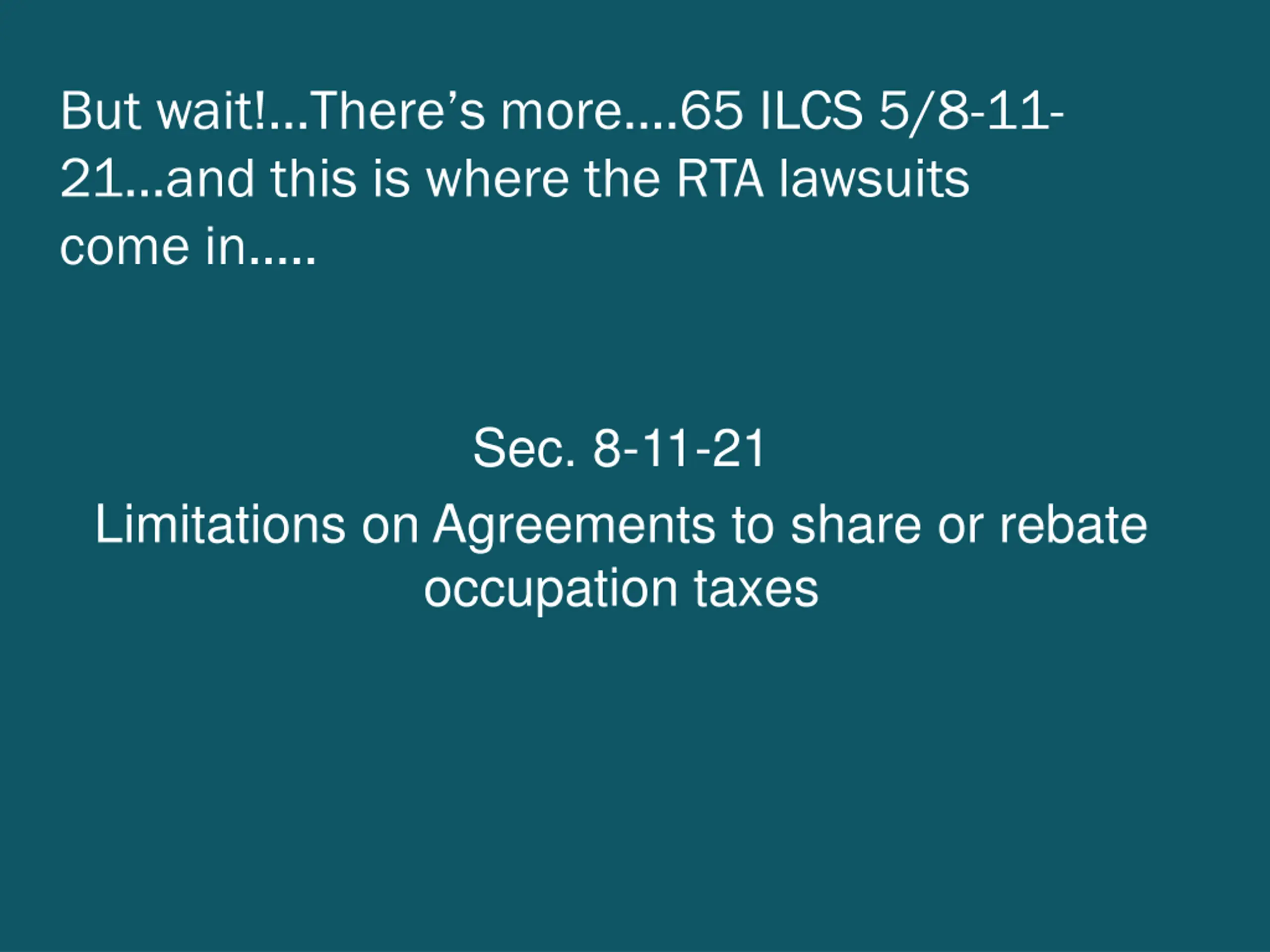 But wait!...Theres more.65 ILCS 5/8-11- 21 and this is where the RTA lawsuits come in .. Sec. 8-11-21 Limitations on Agreements to share or rebate occupation taxes
