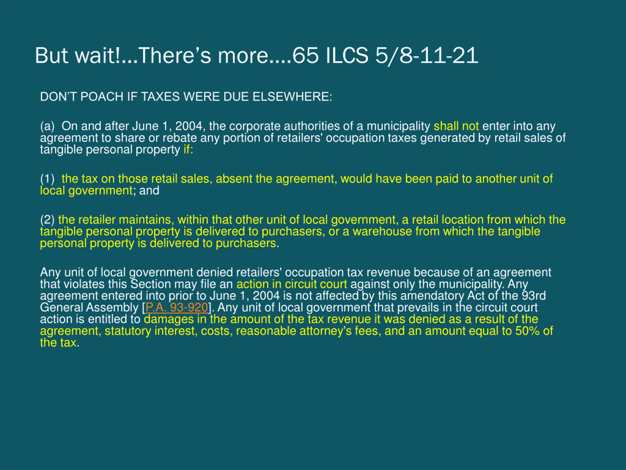 But wait!...Theres more.65 ILCS 5/8-11-21 DON T POACH IF TAXES WERE DUE ELSEWHERE: (a) On and after June 1, 2004, the corporate authorities of a municipality shall not enter into any agreement to share or rebate any portion of retailers' occupation taxes generated by retail sales of tangible personal property if: (1) the tax on those retail sales, absent the agreement, would have been paid to another unit of local government; and (2) the retailer maintains, within that other unit of local government, a retail location from which the tangible personal property is delivered to purchasers, or a warehouse from which the tangible personal property is delivered to purchasers. Any unit of local government denied retailers' occupation tax revenue because of an agreement that violates this Section may file an action in circuit court against only the municipality. Any agreement entered into prior to June 1, 2004 is not affected by this amendatory Act of the 93rd General Assembly [P.A. 93-920]. Any unit of local government that prevails in the circuit court action is entitled to damages in the amount of the tax revenue it was denied as a result of the agreement, statutory interest, costs, reasonable attorney's fees, and an amount equal to 50% of the tax.