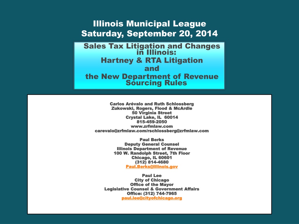 Illinois Municipal League Saturday, September 20, 2014 Sales Tax Litigation and Changes in Illinois: Hartney & RTA Litigation and the New Department of Revenue Sourcing Rules Carlos Carlos Ar valo Ar valo and Ruth Schlossberg and Ruth Schlossberg Zukowski Zukowski, Rogers, Flood & McArdle , Rogers, Flood & McArdle 50 Virginia Street 50 Virginia Street Crystal Lake, IL 60014 Crystal Lake, IL 60014 815 815- -459 459- -2050 www.zrfmlaw.com www.zrfmlaw.com carevalo@zrfmlaw.com/rschlossberg@zrfmlaw.com carevalo@zrfmlaw.com/rschlossberg@zrfmlaw.com 2050 Paul Berks Paul Berks Deputy General Counsel Deputy General Counsel Illinois Department of Revenue Illinois Department of Revenue 100 W. Randolph Street, 7th Floor 100 W. Randolph Street, 7th Floor Chicago, IL 60601 Chicago, IL 60601 (312) 814 (312) 814- -4680 Paul.Berks@Illinois.gov Paul.Berks@Illinois.gov 4680 Paul Lee Paul Lee City of Chicago City of Chicago Office of the Mayor Office of the Mayor Legislative Counsel & Government Affairs Legislative Counsel & Government Affairs Office: (312) 744 Office: (312) 744- -7965 paul.lee@cityofchicago.org paul.lee@cityofchicago.org 7965