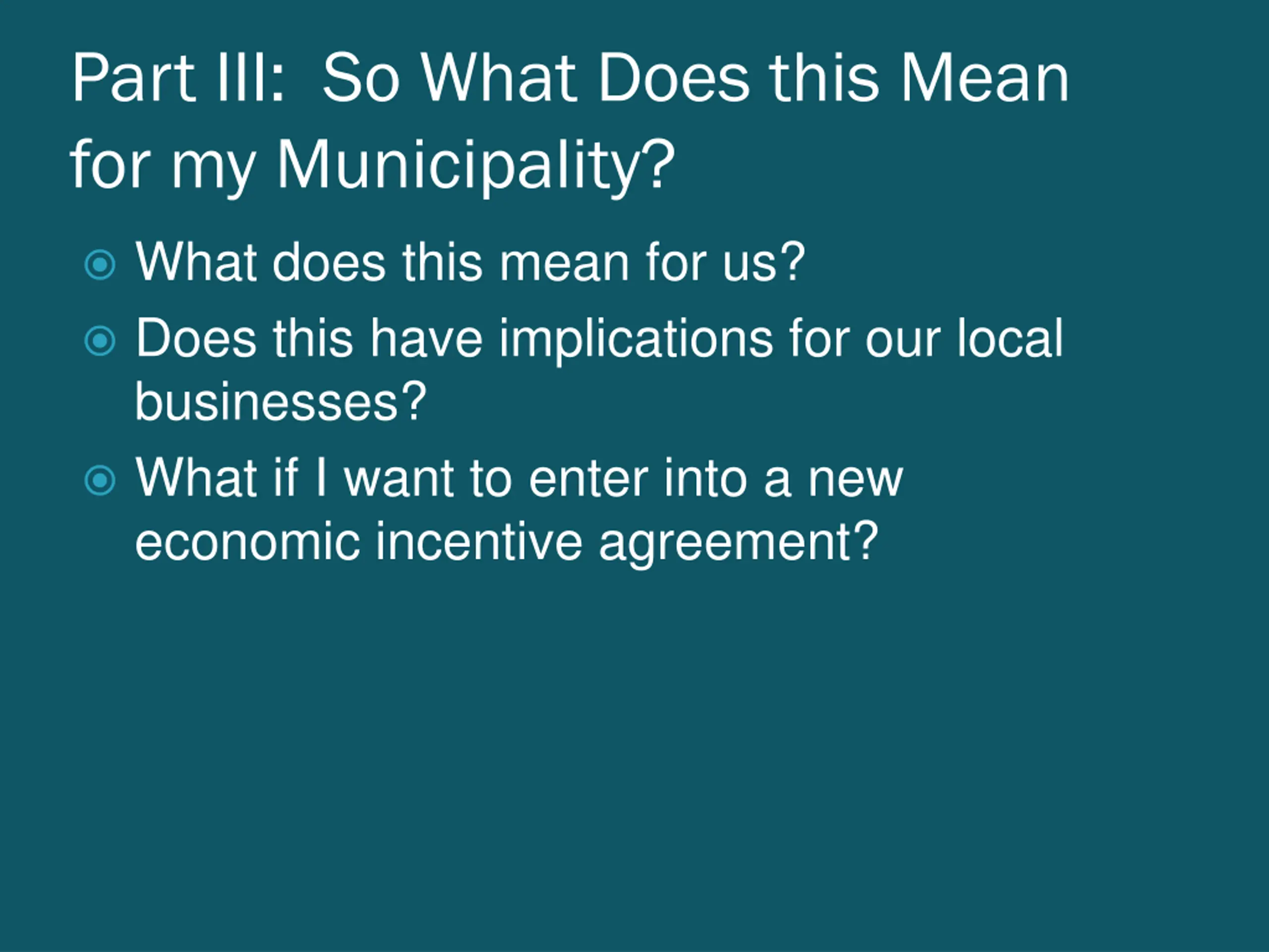 Part III: So What Does this Mean for my Municipality? What does this mean for us? Does this have implications for our local businesses? What if I want to enter into a new economic incentive agreement?