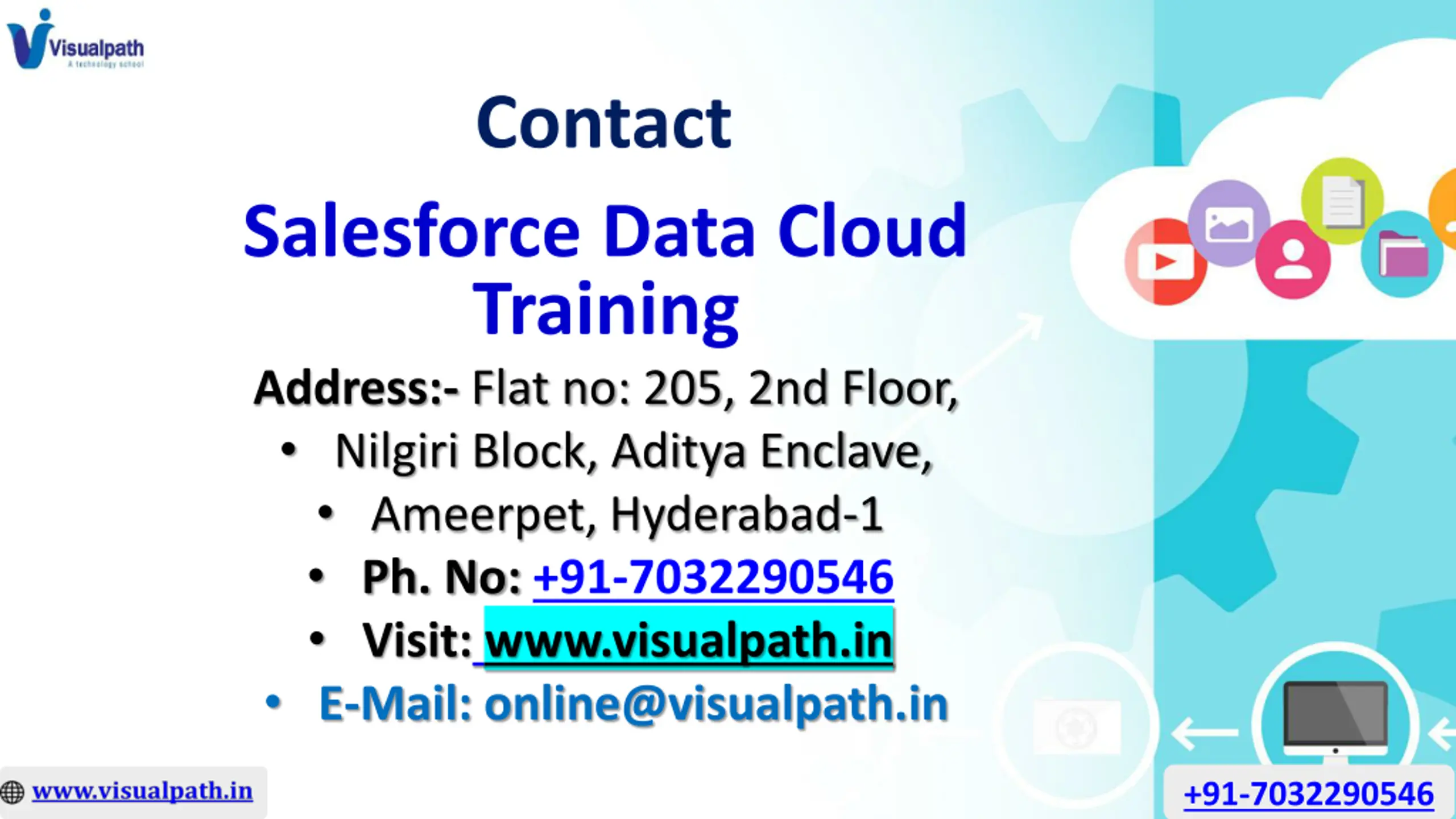 Contact Salesforce Data Cloud Training Address:- Flat no: 205, 2nd Floor, Nilgiri Block, Aditya Enclave, Ameerpet, Hyderabad-1 Ph. No: +91-7032290546 Visit: www.visualpath.in E-Mail: online@visualpath.in +91-7032290546