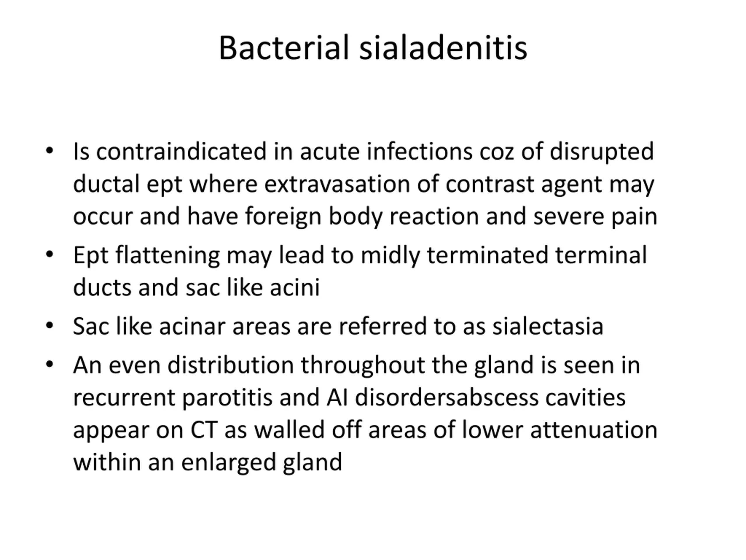 Bacterial sialadenitis Is contraindicated in acute infections coz of disrupted ductal ept where extravasation of contrast agent may occur and have foreign body reaction and severe pain Ept flattening may lead to midly terminated terminal ducts and sac like acini Sac like acinar areas are referred to as sialectasia An even distribution throughout the gland is seen in recurrent parotitis and AI disordersabscess cavities appear on CT as walled off areas of lower attenuation within an enlarged gland
