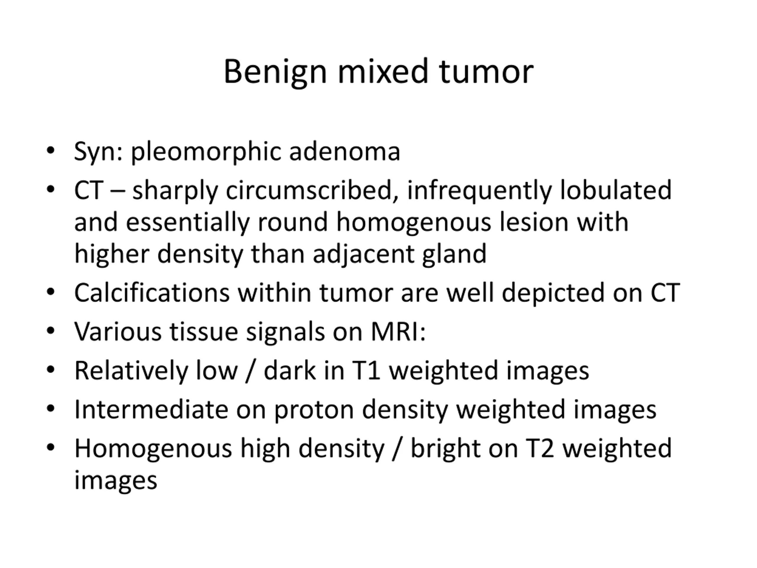 Benign mixed tumor Syn: pleomorphic adenoma CT sharply circumscribed, infrequently lobulated and essentially round homogenous lesion with higher density than adjacent gland Calcifications within tumor are well depicted on CT Various tissue signals on MRI: Relatively low / dark in T1 weighted images Intermediate on proton density weighted images Homogenous high density / bright on T2 weighted images