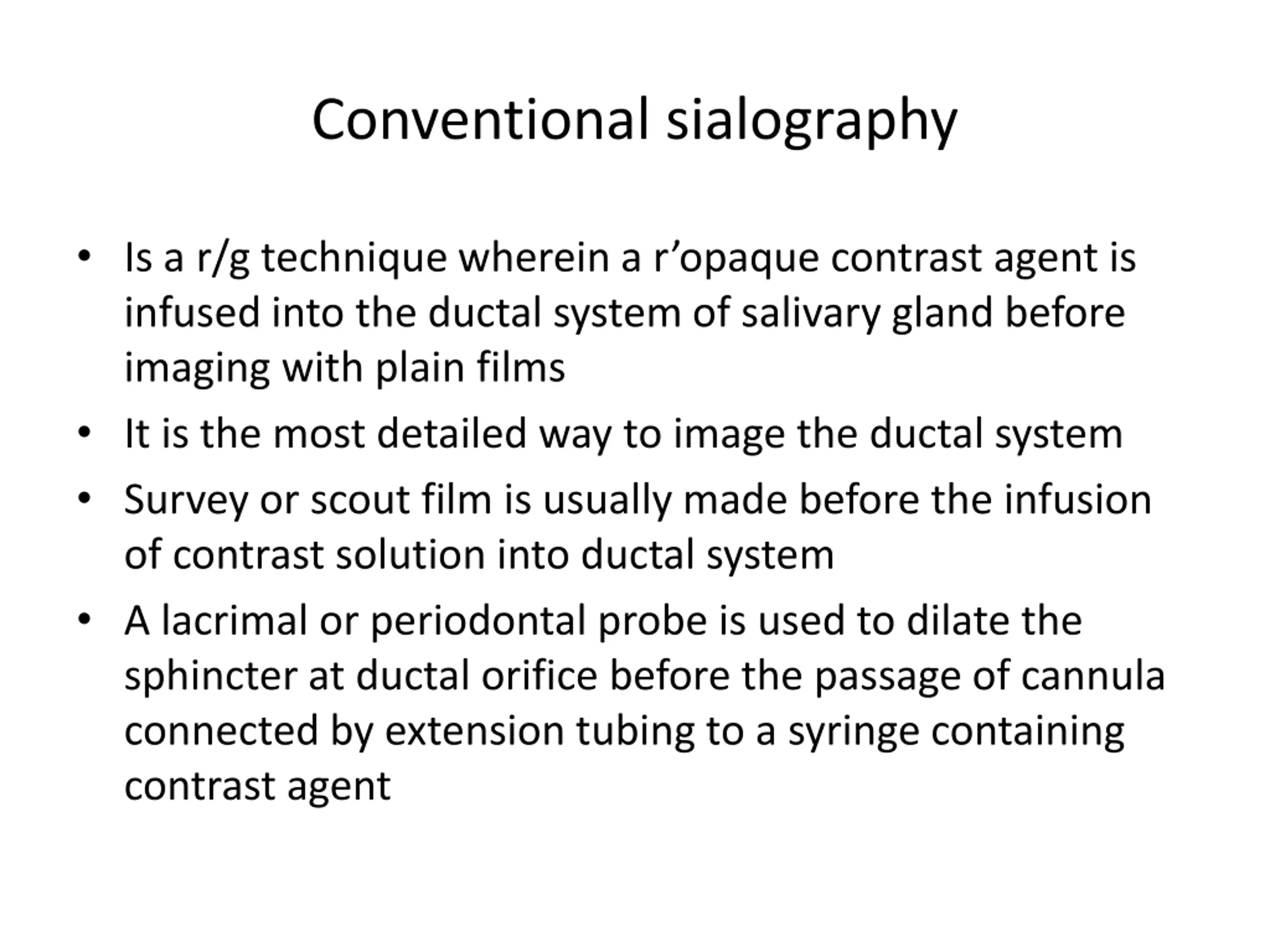 Conventional sialography Is a r/g technique wherein a r opaque contrast agent is infused into the ductal system of salivary gland before imaging with plain films It is the most detailed way to image the ductal system Survey or scout film is usually made before the infusion of contrast solution into ductal system A lacrimal or periodontal probe is used to dilate the sphincter at ductal orifice before the passage of cannula connected by extension tubing to a syringe containing contrast agent