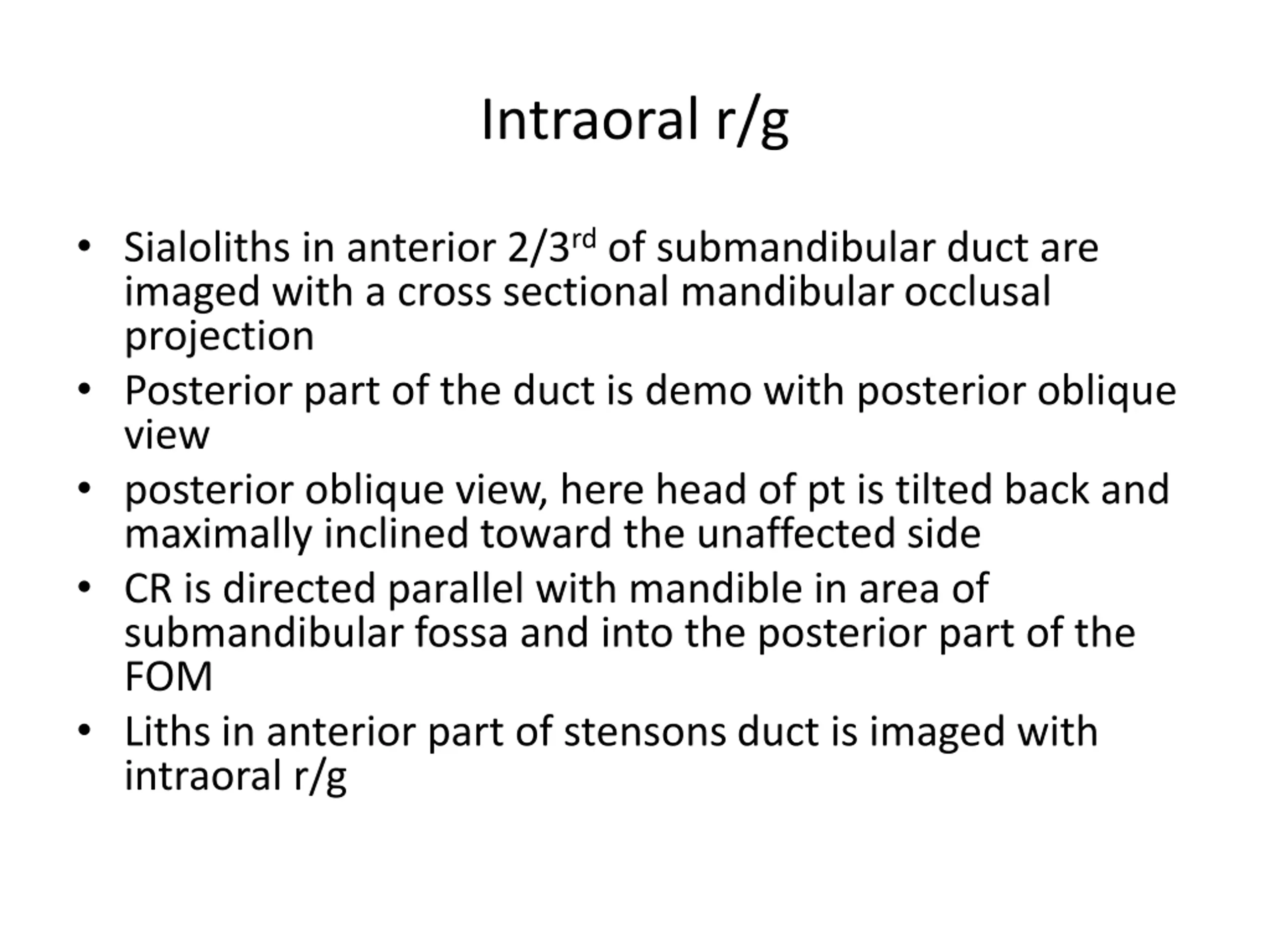 Intraoral r/g Sialoliths in anterior 2/3rdof submandibular duct are imaged with a cross sectional mandibular occlusal projection Posterior part of the duct is demo with posterior oblique view posterior oblique view, here head of pt is tilted back and maximally inclined toward the unaffected side CR is directed parallel with mandible in area of submandibular fossa and into the posterior part of the FOM Liths in anterior part of stensons duct is imaged with intraoral r/g