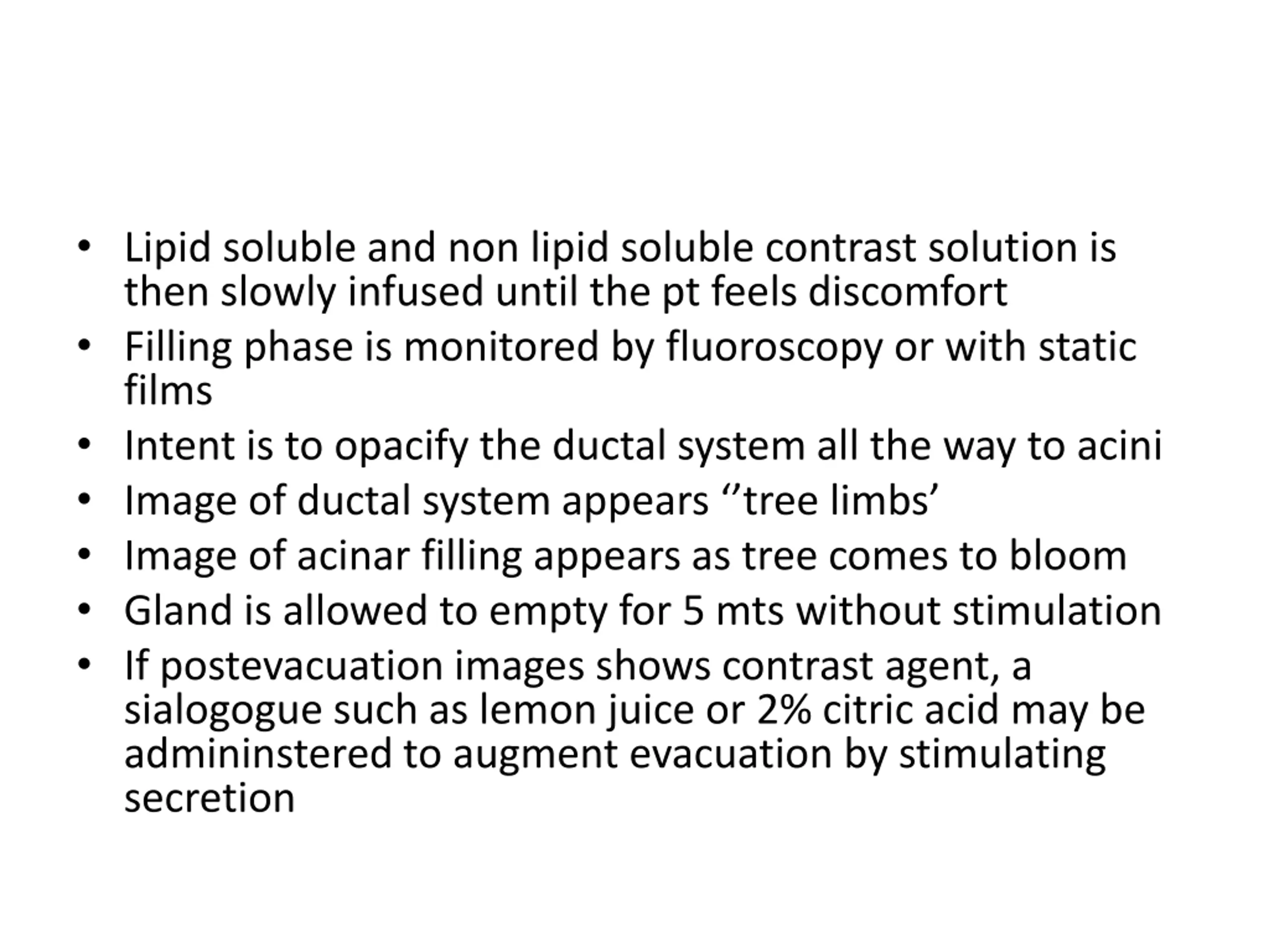 Lipid soluble and non lipid soluble contrast solution is then slowly infused until the pt feels discomfort Filling phase is monitored by fluoroscopy or with static films Intent is to opacify the ductal system all the way to acini Image of ductal system appears tree limbs Image of acinar filling appears as tree comes to bloom Gland is allowed to empty for 5 mts without stimulation If postevacuation images shows contrast agent, a sialogogue such as lemon juice or 2% citric acid may be admininstered to augment evacuation by stimulating secretion
