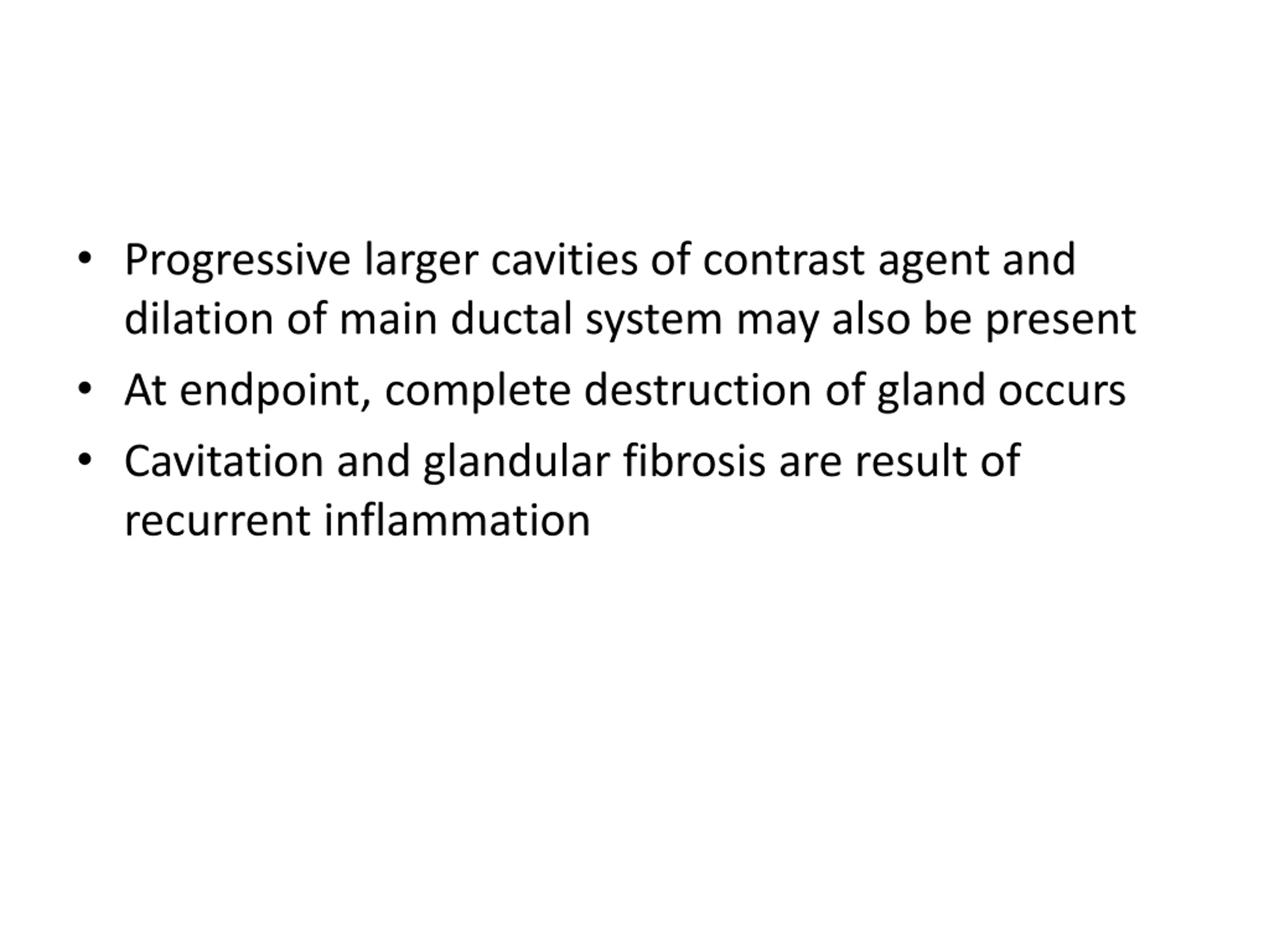 Progressive larger cavities of contrast agent and dilation of main ductal system may also be present At endpoint, complete destruction of gland occurs Cavitation and glandular fibrosis are result of recurrent inflammation