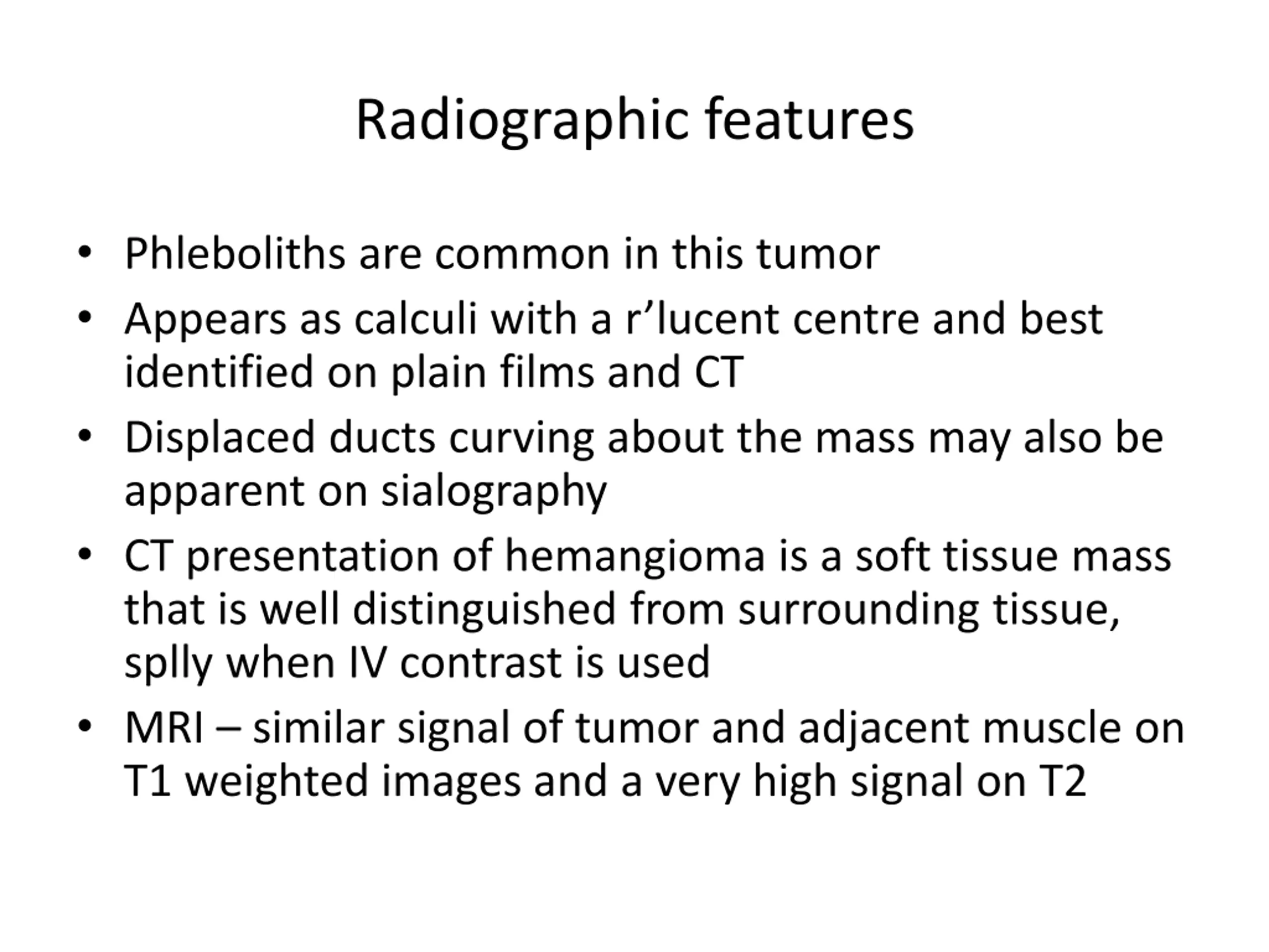 Radiographic features Phleboliths are common in this tumor Appears as calculi with a r lucent centre and best identified on plain films and CT Displaced ducts curving about the mass may also be apparent on sialography CT presentation of hemangioma is a soft tissue mass that is well distinguished from surrounding tissue, splly when IV contrast is used MRI similar signal of tumor and adjacent muscle on T1 weighted images and a very high signal on T2