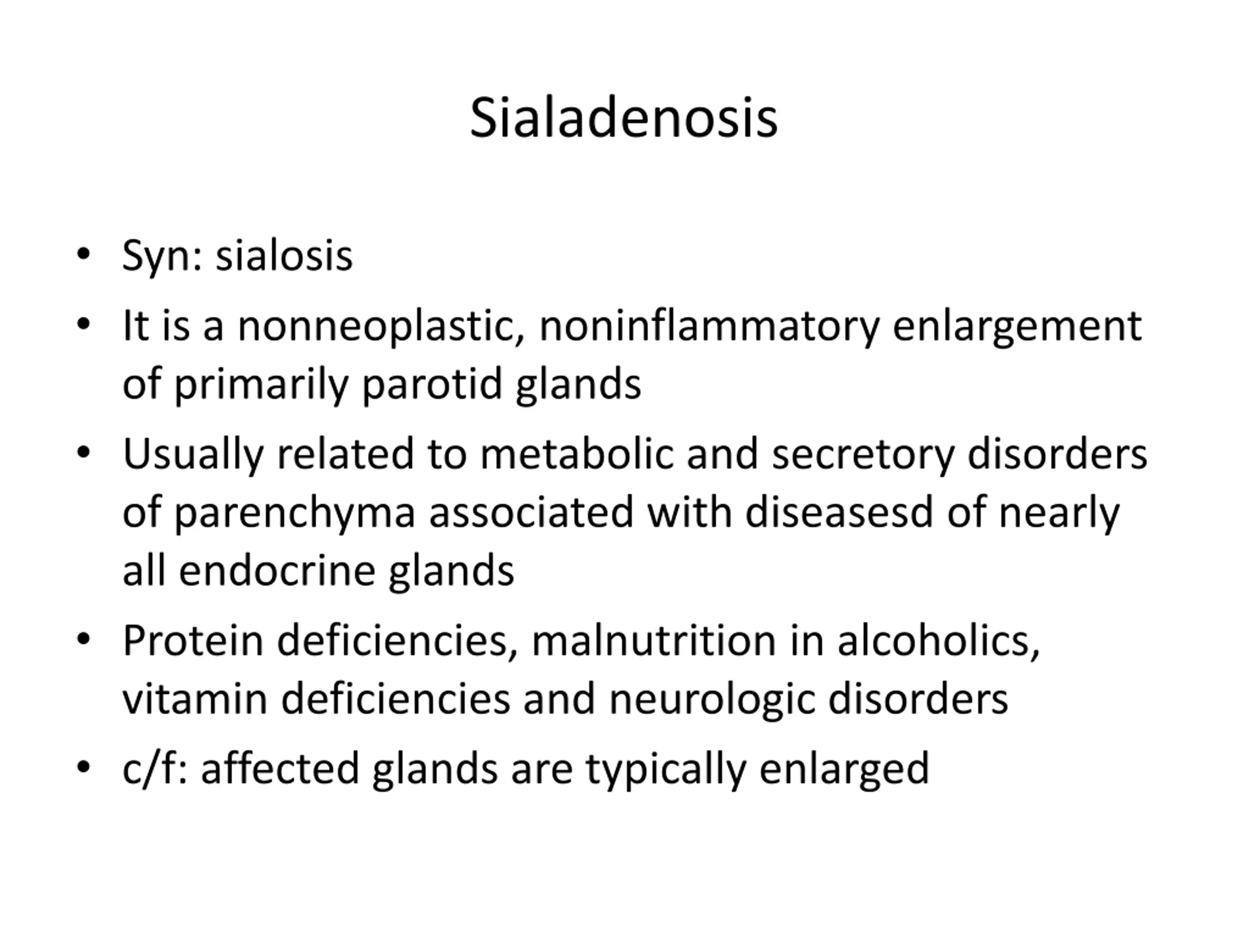 Sialadenosis Syn: sialosis It is a nonneoplastic, noninflammatory enlargement of primarily parotid glands Usually related to metabolic and secretory disorders of parenchyma associated with diseasesd of nearly all endocrine glands Protein deficiencies, malnutrition in alcoholics, vitamin deficiencies and neurologic disorders c/f: affected glands are typically enlarged